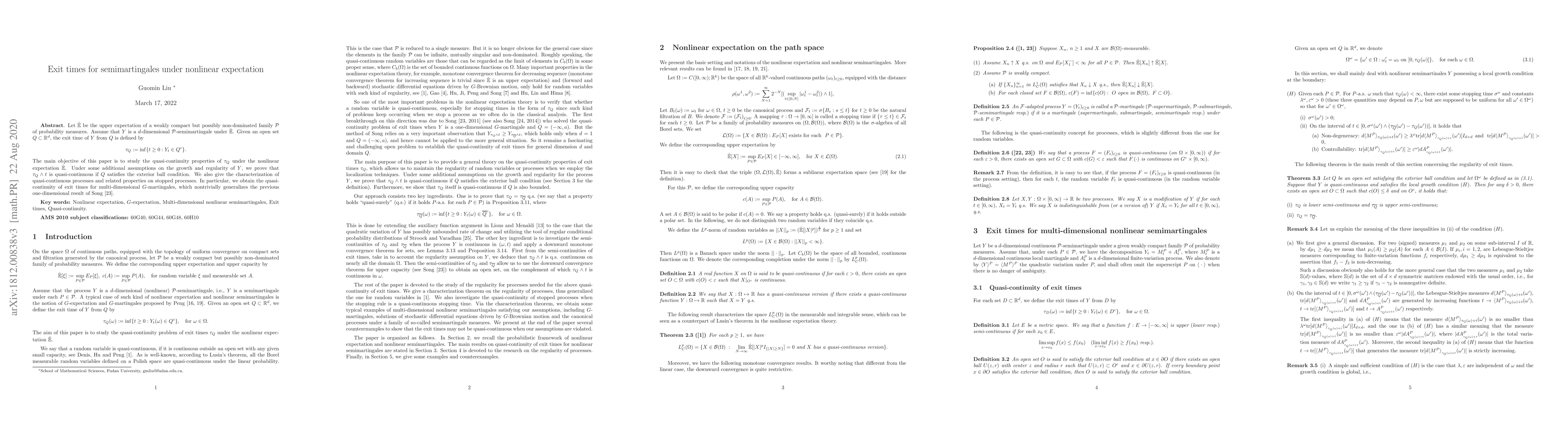 This research paper studies the exit times of semimartingales under nonlinear expectation, focusing on quasi-continuity properties and their implications for multi-dimensional processes.