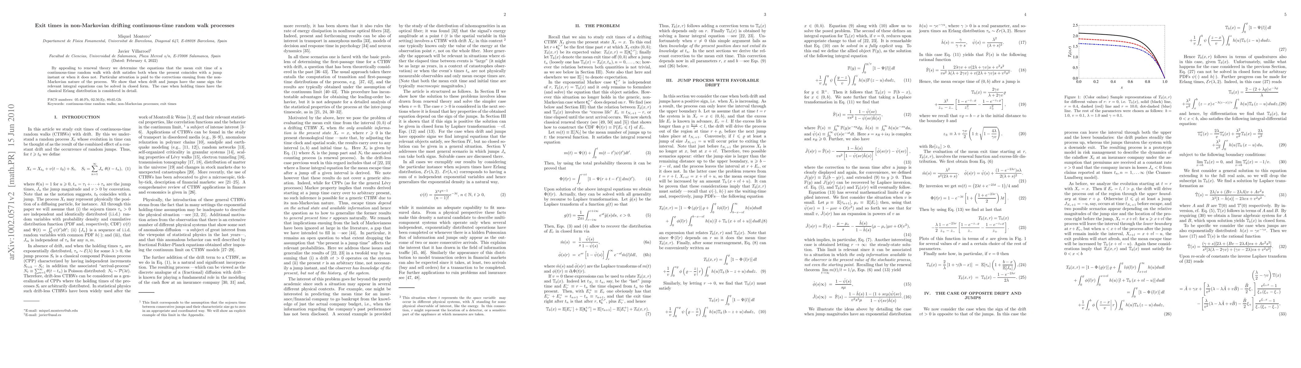 The research uses renewal theory to determine the equations that the mean exit time of a continuous-time random walk with drift satisfies, considering both when the present coincides with a jump instant and when it does not, with particular attention to corrections from the non-Markovian nature of the process.