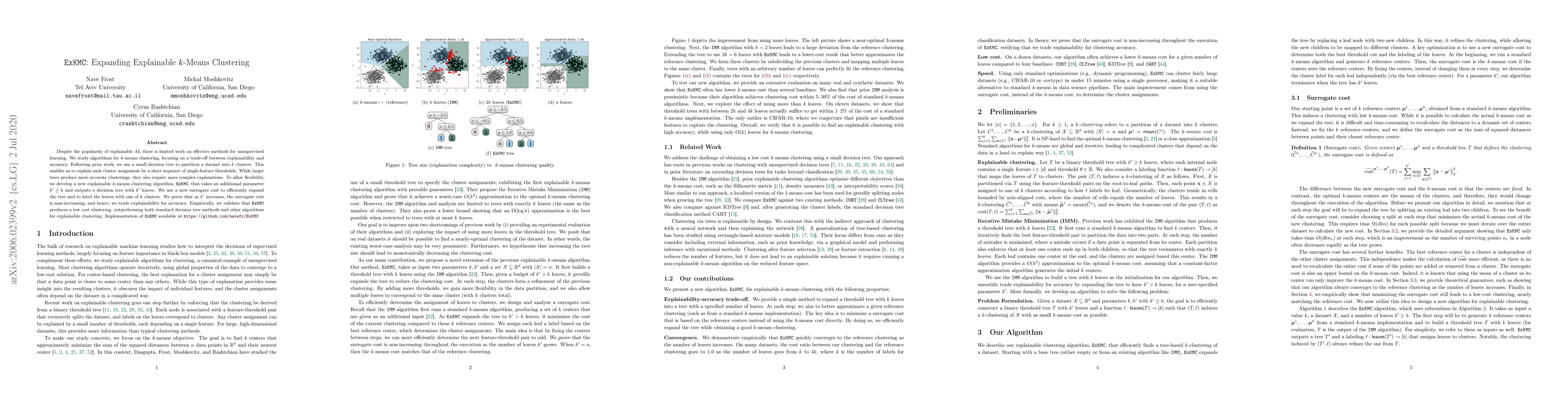 ExKMC introduces a new explainable $k$-means clustering algorithm that balances explainability and accuracy by using a decision tree with adjustable leaf count. The method efficiently expands the tree to trade explainability for improved clustering accuracy.