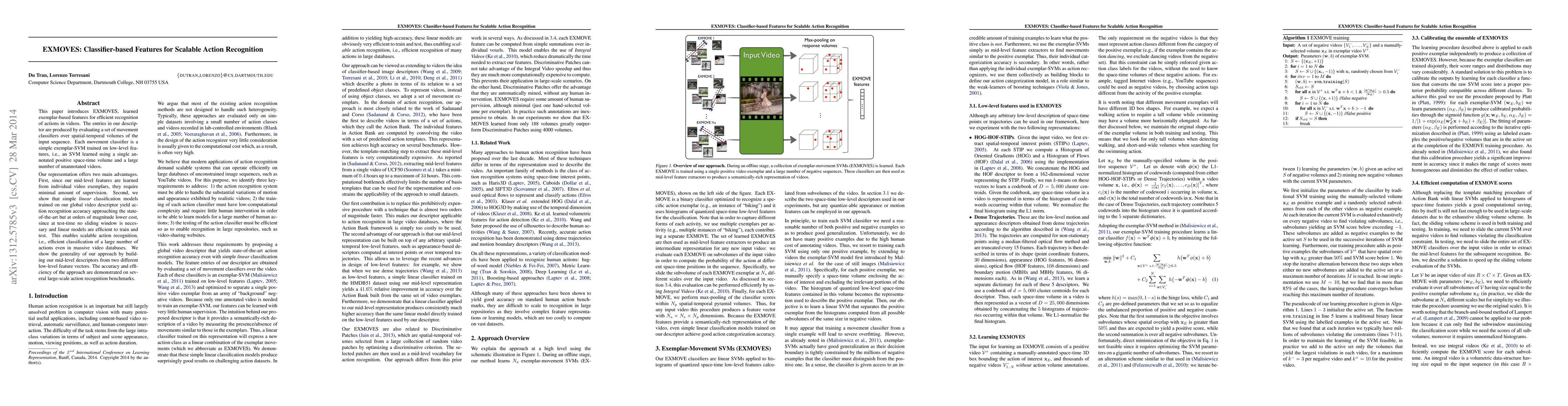 This paper presents EXMOVES, a classifier-based feature for scalable action recognition in videos, utilizing exemplar-SVMs trained on low-level features. The approach achieves high accuracy with minimal supervision and computational efficiency, enabling effective large-scale action classification.