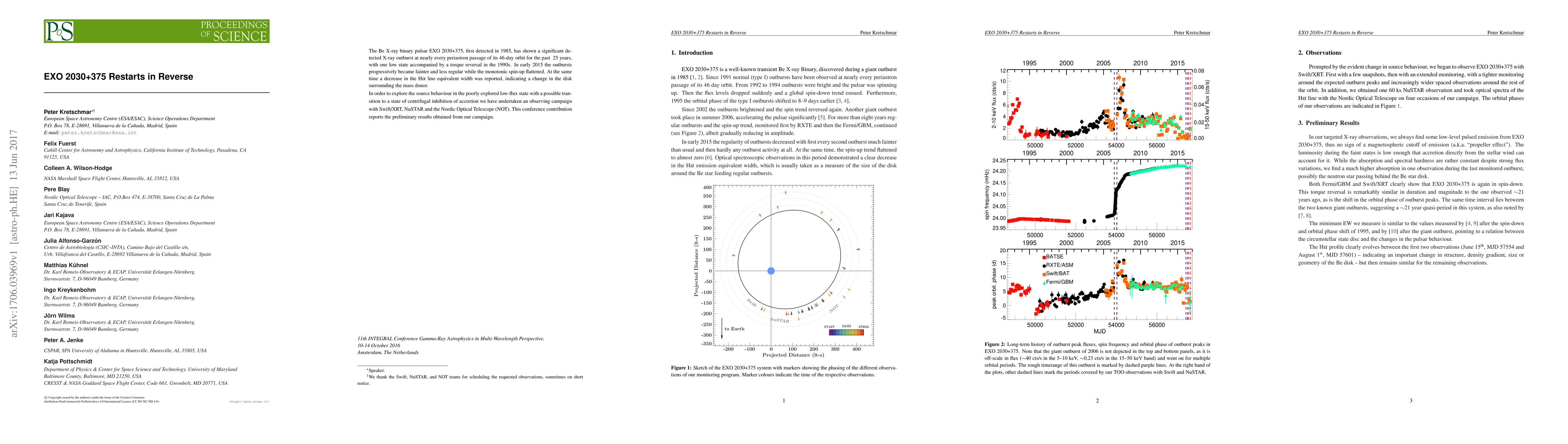 The Be X-ray binary pulsar EXO 2030+375, first detected in 1985, has shown a significant detected X-ray outburst at nearly every periastron passage of its 46-day orbit for the past ~25 years, with one low state accompanied by a torque reversal in the 1990s. In early 2015 the outbursts progressively became fainter and less regular while the monotonic spin-up flattened. At the same time a decrease in the H$\alpha$ line equivalent width was reported, indicating a change in the disk surrounding the mass donor. In order to explore the source behaviour in the poorly explored low-flux state with a possible transition to a state of centrifugal inhibition of accretion we have undertaken an observing campaign with Swift/XRT, NuSTAR and the Nordic Optical Telescope (NOT). This conference contribution reports the preliminary results obtained from our campaign.
