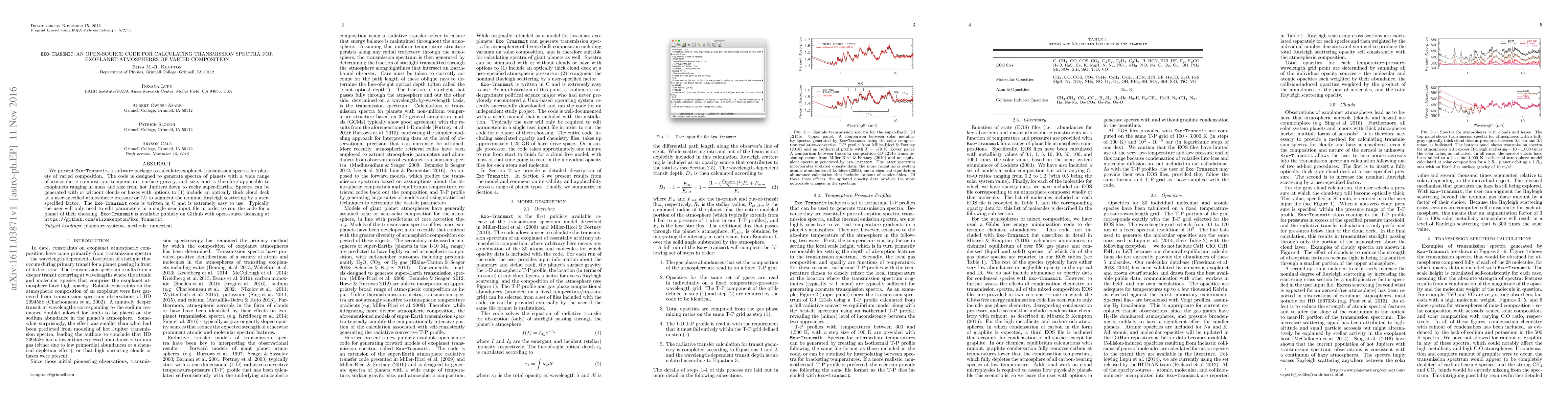 Exo-Transmit is an open-source C code for calculating transmission spectra of exoplanets with diverse atmospheric compositions. It allows users to generate spectra for planets of various sizes and compositions, including options for cloud and haze effects.