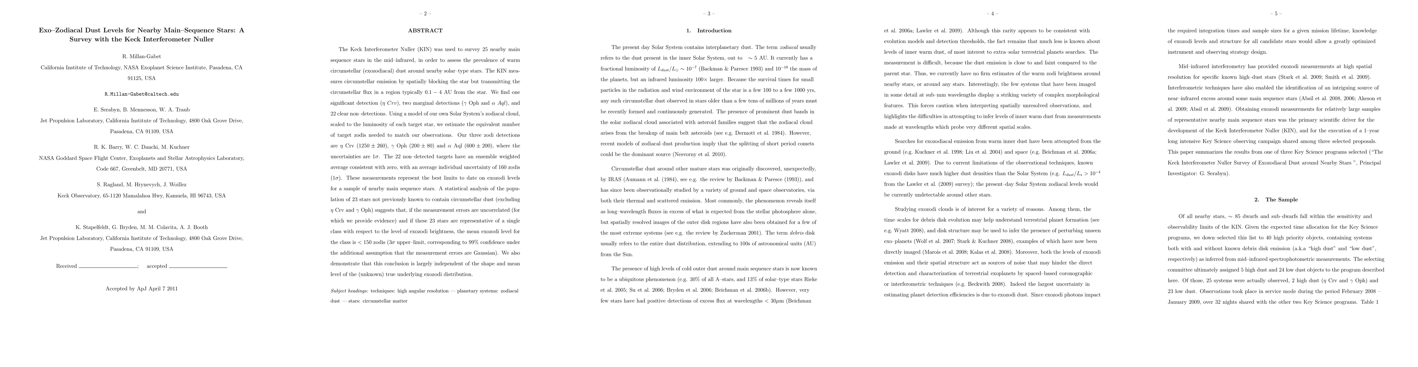 The Keck Interferometer Nuller (KIN) detected warm circumstellar dust around three nearby main sequence stars, while 22 others showed no significant detection, providing the best limits to date on exozodiacal dust levels. The mean exozodi level for 23 stars without prior detections is estimated to be <150 zodis (3-sigma upper-limit).