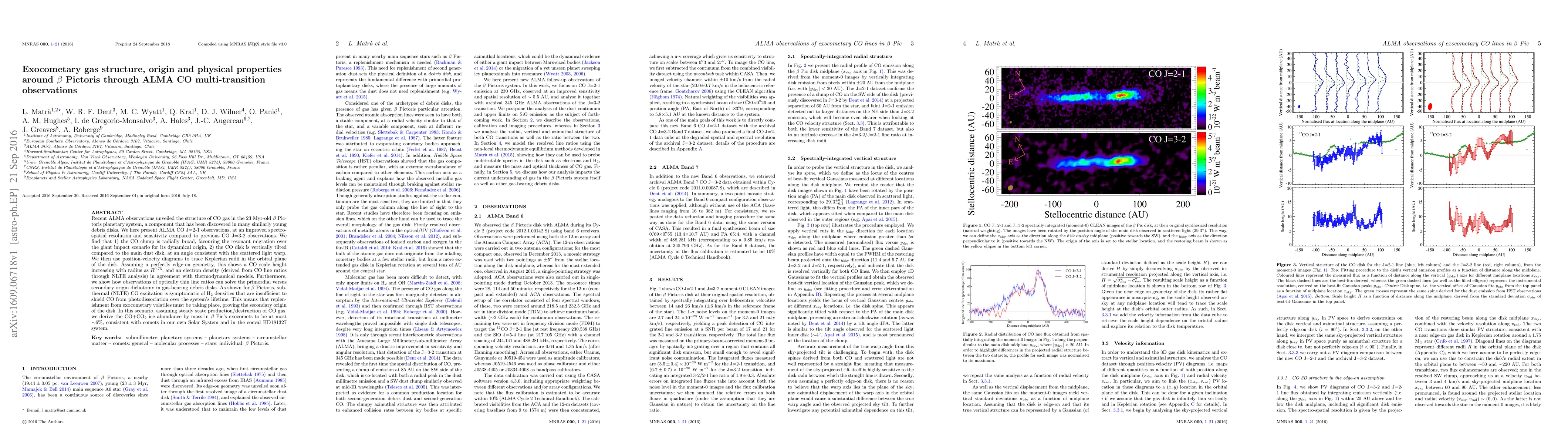 Recent ALMA observations unveiled the structure of CO gas in the 23 Myr-old $\beta$ Pictoris planetary system, a component that has been discovered in many similarly young debris disks. We here present ALMA CO J=2-1 observations, at an improved spectro-spatial resolution and sensitivity compared to previous CO J=3-2 observations. We find that 1) the CO clump is radially broad, favouring the resonant migration over the giant impact scenario for its dynamical origin, 2) the CO disk is vertically tilted compared to the main dust disk, at an angle consistent with the scattered light warp. We then use position-velocity diagrams to trace Keplerian radii in the orbital plane of the disk. Assuming a perfectly edge-on geometry, this shows a CO scale height increasing with radius as $R^{0.75}$, and an electron density (derived from CO line ratios through NLTE analysis) in agreement with thermodynamical models. Furthermore, we show how observations of optically thin line ratios can solve the primordial versus secondary origin dichotomy in gas-bearing debris disks. As shown for $\beta$ Pictoris, subthermal (NLTE) CO excitation is symptomatic of H$_2$ densities that are insufficient to shield CO from photodissociation over the system's lifetime. This means that replenishment from exocometary volatiles must be taking place, proving the secondary origin of the disk. In this scenario, assuming steady state production/destruction of CO gas, we derive the CO+CO$_2$ ice abundance by mass in $\beta$ Pic's exocomets to be at most $\sim$6%, consistent with comets in our own Solar System and in the coeval HD181327 system.