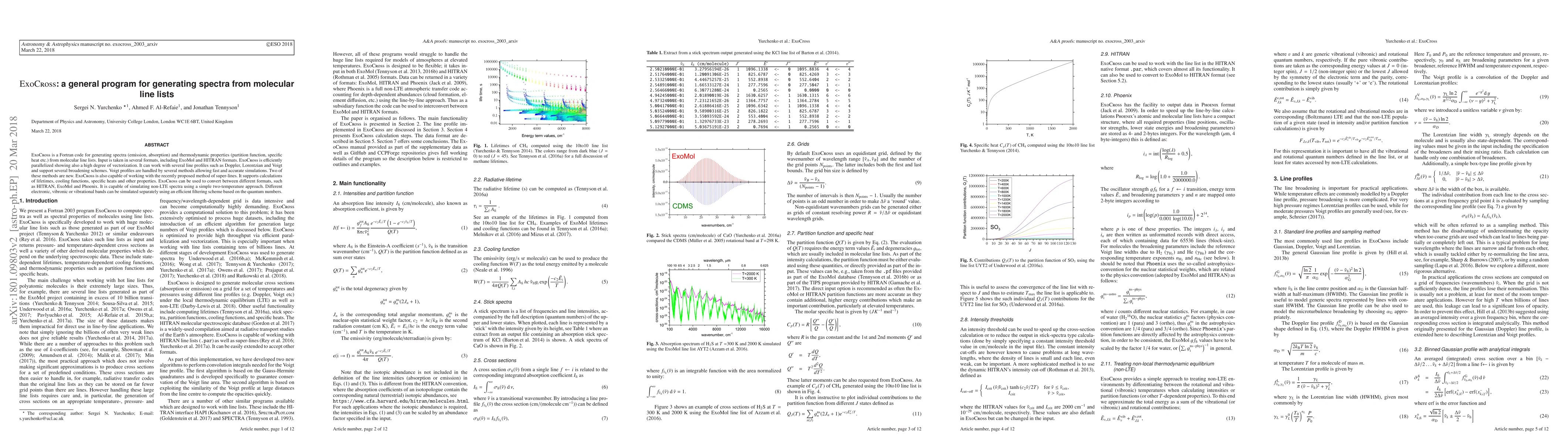 ExoCross is a Fortran program for generating spectra and thermodynamic properties from molecular line lists, supporting multiple input formats and parallelization. It efficiently handles various line profiles and broadening schemes, including new methods for Voigt profiles and super-lines, and can simulate non-LTE spectra.