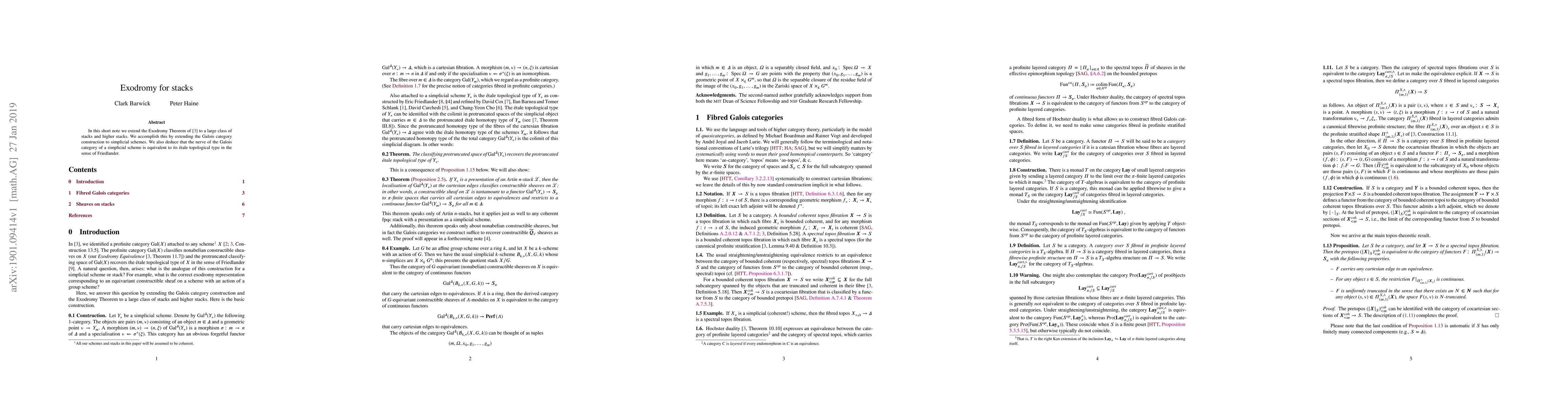 In this short note we extend the Exodromy Theorem of arXiv:1807.03281 to a large class of stacks and higher stacks. We accomplish this by extending the Galois category construction to simplicial schemes. We also deduce that the nerve of the Galois category of a simplicial scheme is equivalent to its \'etale topological type in the sense of Friedlander.