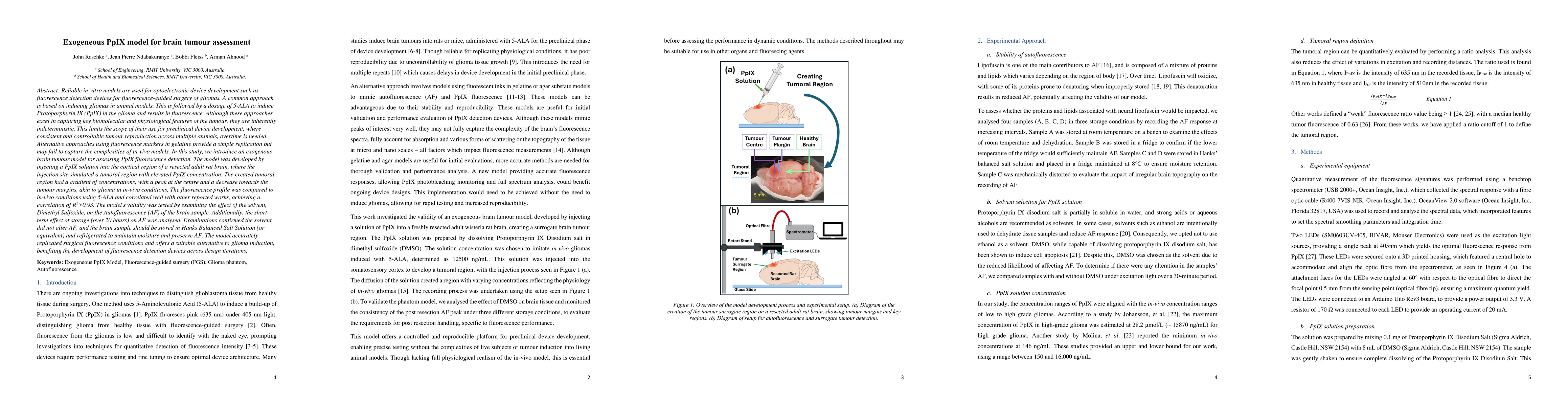 Reliable in-vitro models are used for optoelectronic device development such as fluorescence detection devices for fluorescence-guided surgery of gliomas. A common approach is based on inducing gliomas in animal models. This is followed by a dosage of 5-ALA to induce Protoporphyrin IX (PpIX) in the glioma and which fluoresces. Although these approaches excel in capturing key biomolecular and physiological features of the tumour, they are inherently indeterministic. This limits the scope of their use for preclinical device development, where consistent and controllable tumour reproduction across multiple animals is needed. Approaches using fluorescence markers in gelatine provide a simple replication but fail to capture the complexities of in-vivo models. In this study, we introduce an exogenous brain tumour model for assessing PpIX fluorescence detection. The model was developed by injecting a PpIX solution into the cortical region of a resected adult rat brain, the injection site simulated a tumoral region with elevated PpIX concentration. The tumoral region had a gradient of concentrations, with a peak at the centre and a decrease towards the margins, akin to in-vivo gliomas. The fluorescence profile was compared to in-vivo conditions using 5-ALA and correlated well with other reported works, achieving a correlation of R2>0.93. The model's validity was tested by examining the effect of the solvent, DMSO, on the Autofluorescence (AF) of the brain sample and the short-term effect of storage on AF was analysed. Examinations confirmed the solvent did not alter AF, and the brain sample should be stored in Hanks Balanced Salt Solution and refrigerated to maintain moisture and preserve AF. The model accurately replicated surgical fluorescence conditions and offers a suitable alternative to glioma induction, benefiting the development of fluorescence detection devices across design iterations.