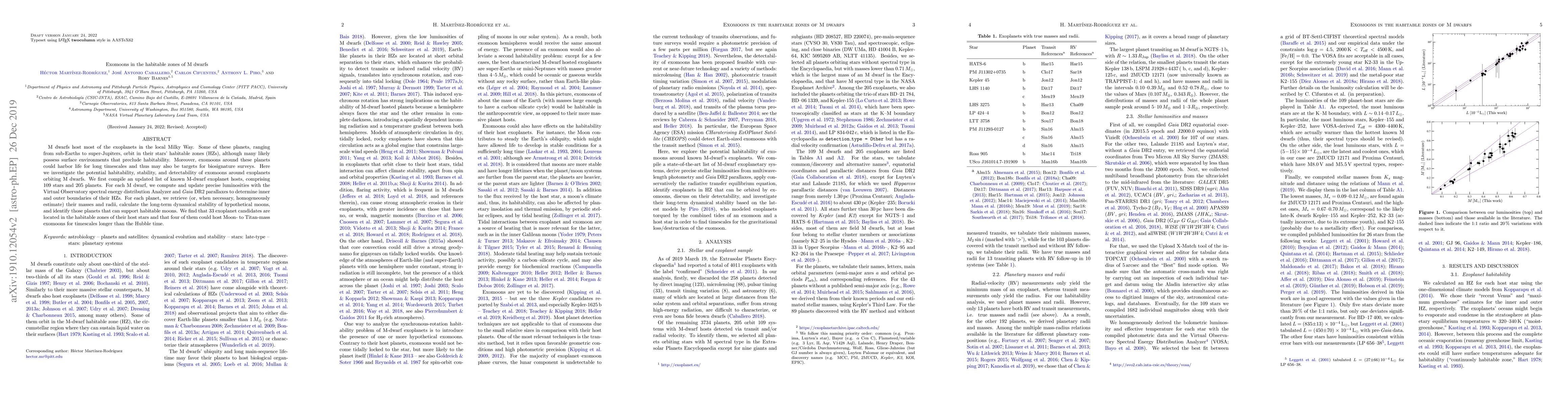 M dwarfs host most of the exoplanets in the local Milky Way. Some of these planets, ranging from sub-Earths to super-Jupiters, orbit in their stars' habitable zones (HZs), although many likely possess surface environments that preclude habitability. Moreover, exomoons around these planets could harbor life for long timescales and thus may also be targets for biosignature surveys. Here we investigate the potential habitability, stability, and detectability of exomoons around exoplanets orbiting M dwarfs. We first compile an updated list of known M-dwarf exoplanet hosts, comprising 109 stars and 205 planets. For each M dwarf, we compute and update precise luminosities with the Virtual Observatory spectral energy distribution Analyzer and Gaia DR2 parallaxes to determine inner and outer boundaries of their HZs. For each planet, we retrieve (or, when necessary, homogeneously estimate) their masses and radii, calculate the long-term dynamical stability of hypothetical moons, and identify those planets that can support habitable moons. We find that 33 exoplanet candidates are located in the HZs of their host stars and that four of them could host Moon- to Titan-mass exomoons for timescales longer than the Hubble time.