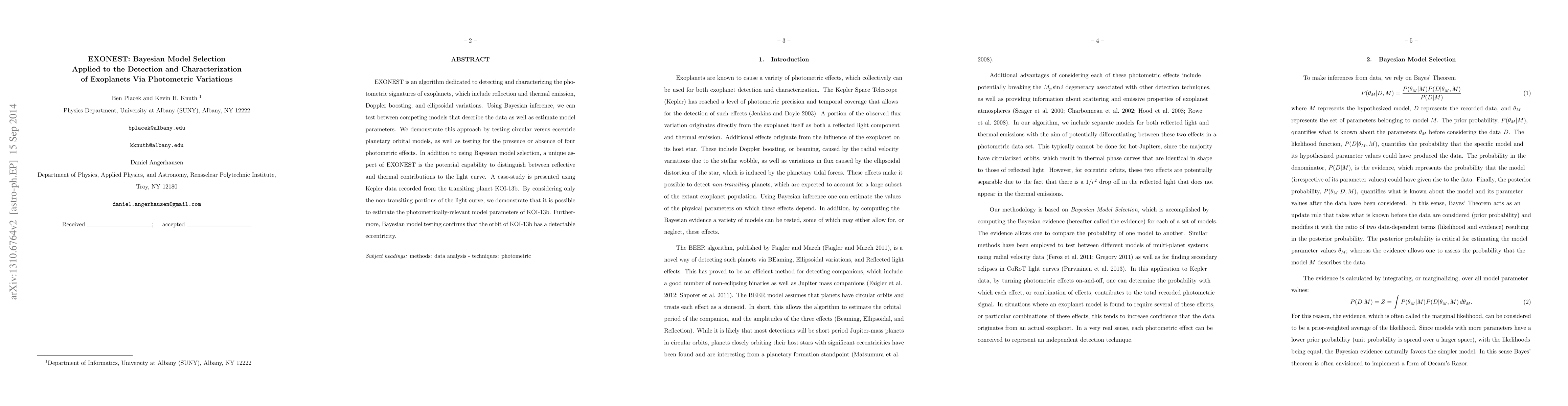 EXONEST employs Bayesian Model Selection to detect and characterize exoplanets through photometric variations, distinguishing between reflective and thermal light contributions. It successfully estimates the parameters of KOI-13b and confirms the planet's eccentric orbit using Kepler data.