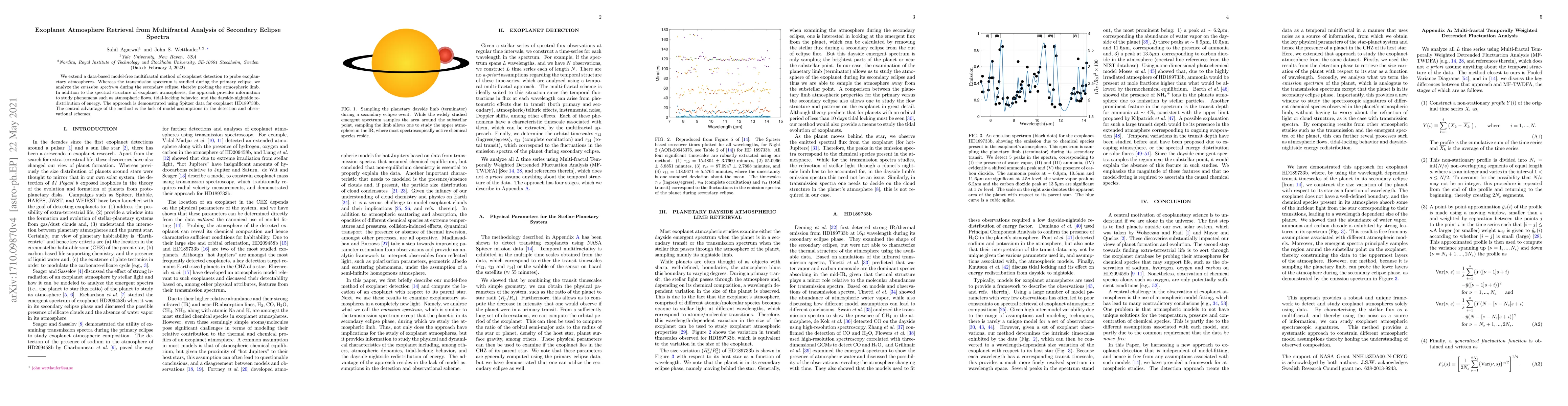 We extend a data-based model-free multifractal method of exoplanet detection to probe exoplanetary atmospheres. Whereas the transmission spectrum is studied during the primary eclipse, we analyze the emission spectrum during the secondary eclipse, thereby probing the atmospheric limb. In addition to the spectral structure of exoplanet atmospheres, the approach provides information to study phenomena such as atmospheric flows, tidal-locking behavior, and the dayside-nightside redistribution of energy. The approach is demonstrated using Spitzer data for exoplanet HD189733b. The central advantage of the method is the lack of model assumptions in the detection and observational schemes.