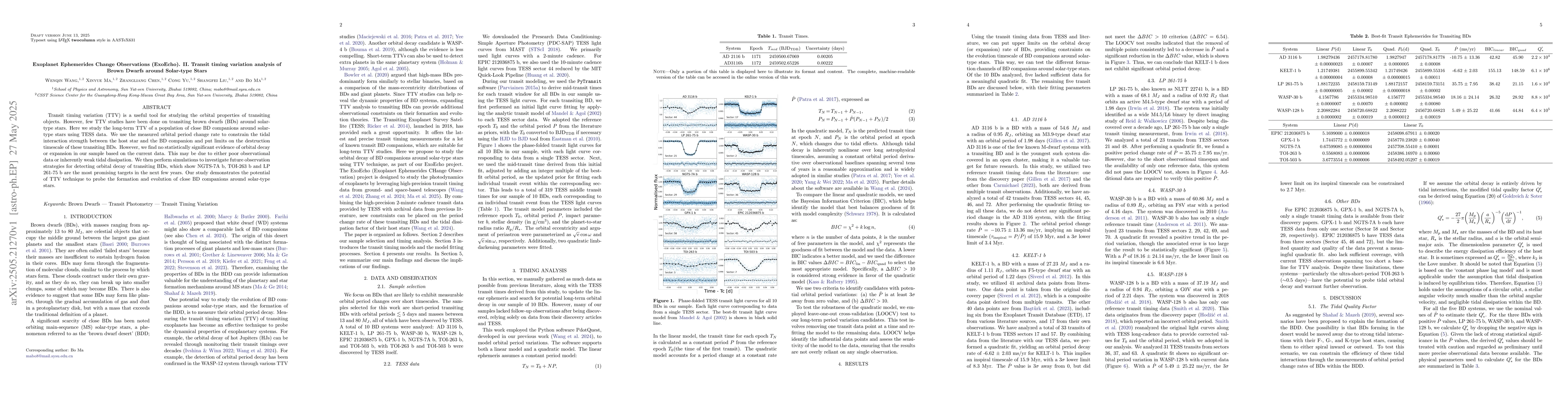 This research focuses on transit timing variations of brown dwarfs around solar-type stars, an understudied area, and proposes future observation strategies to overcome current limitations in detecting orbital decay.