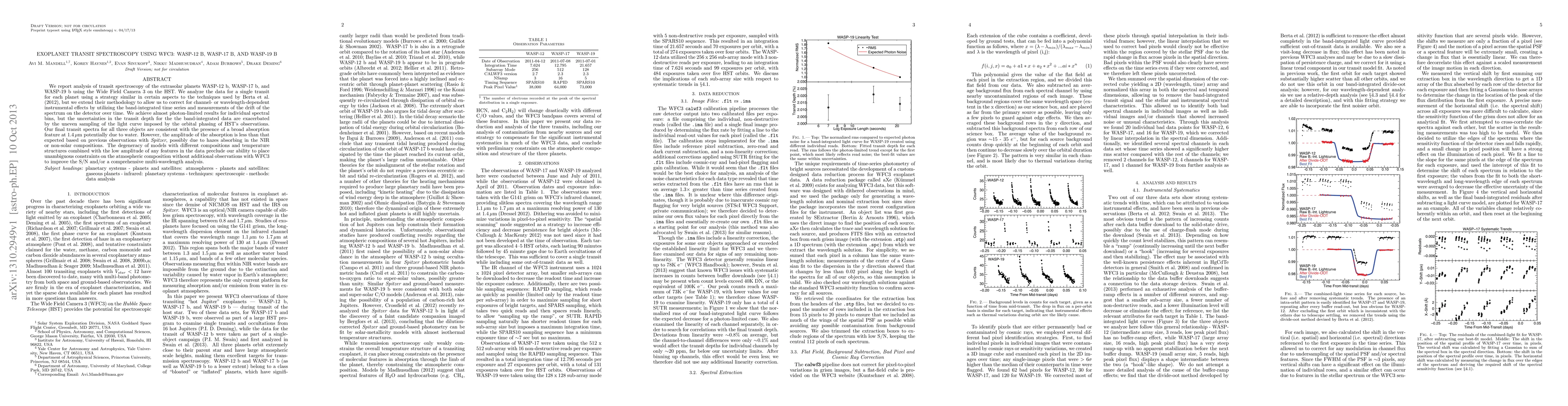 This study uses WFC3 on HST to perform transit spectroscopy on the exoplanets WASP-12 b, WASP-17 b, and WASP-19 b, revealing a broad absorption feature at 1.4 microns potentially due to water. However, the feature's amplitude is lower than expected, possibly due to hazes or non-solar atmospheric compositions, limiting definitive compositional conclusions.