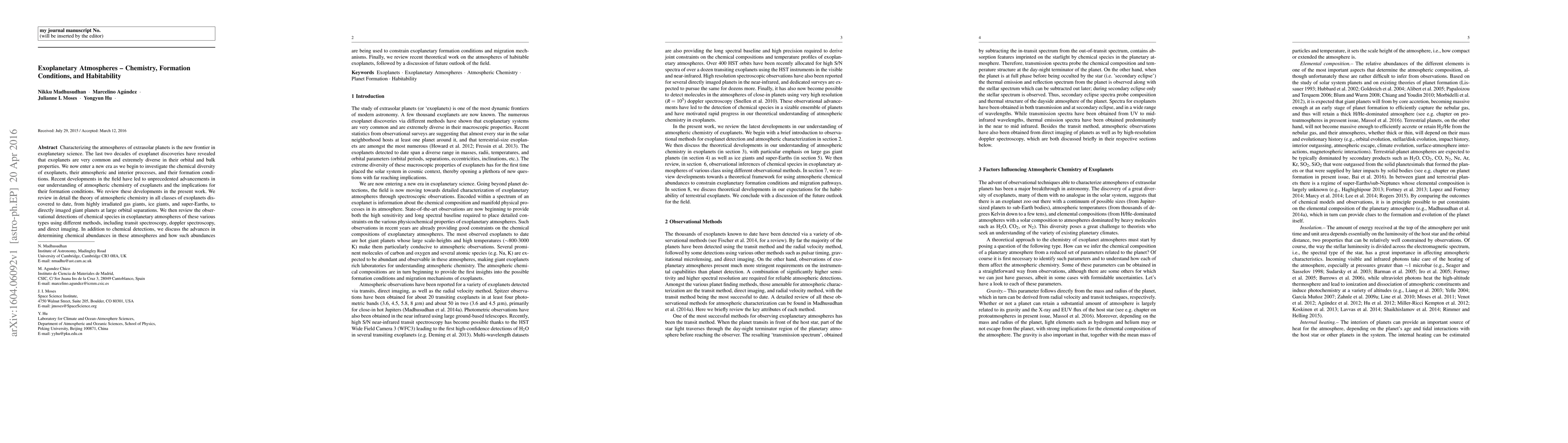 This paper reviews recent advancements in understanding exoplanetary atmospheres, focusing on their chemical diversity, formation conditions, and implications for habitability. It covers observational detections and theoretical models across various exoplanet types, highlighting the role of atmospheric chemistry in constraining formation and migration mechanisms.