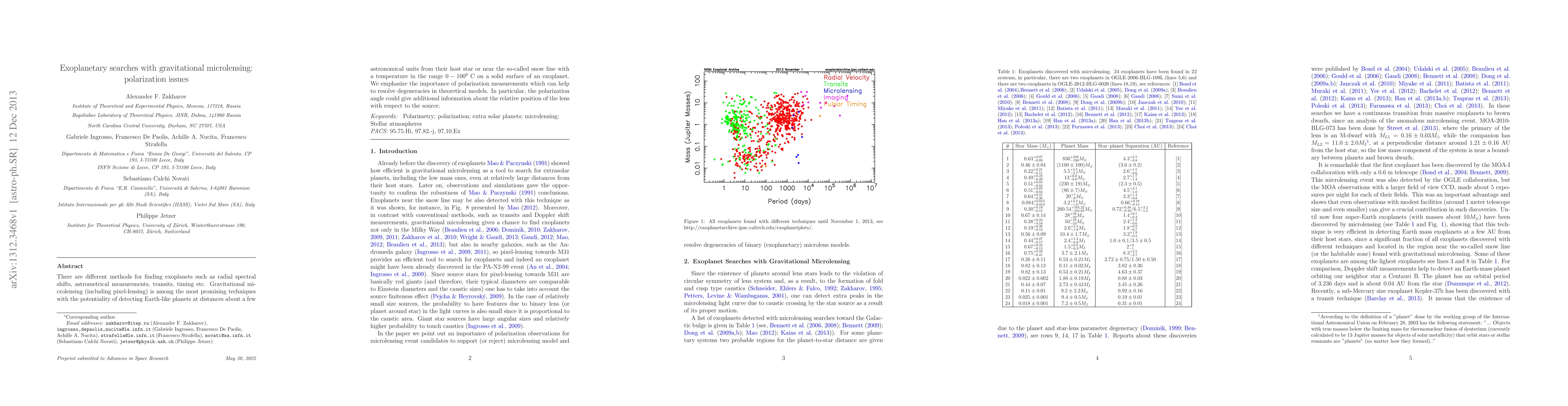 There are different methods for finding exoplanets such as radial spectral shifts, astrometrical measurements, transits, timing etc. Gravitational microlensing (including pixel-lensing) is among the most promising techniques with the potentiality of detecting Earth-like planets at distances about a few astronomical units from their host star or near the so-called snow line with a temperature in the range $0-100^0$ C on a solid surface of an exoplanet. We emphasize the importance of polarization measurements which can help to resolve degeneracies in theoretical models. In particular, the polarization angle could give additional information about the relative position of the lens with respect to the source.
