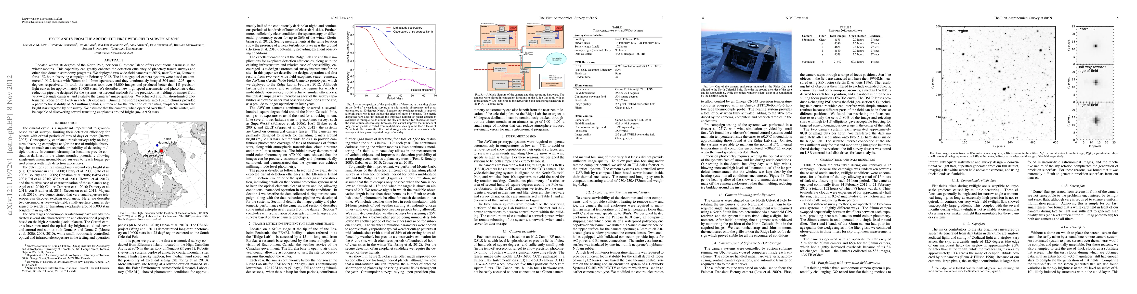 Located within 10 degrees of the North Pole, northern Ellesmere Island offers continuous darkness in the winter months. This capability can greatly enhance the detection efficiency of planetary transit surveys and other time domain astronomy programs. We deployed two wide-field cameras at 80 degrees North, near Eureka, Nunavut, for a 152-hour observing campaign in February 2012. The 16-megapixel-camera systems were based on commercial f/1.2 lenses with 70mm and 42mm apertures, and they continuously imaged 504 and 1,295 square degrees respectively. In total, the cameras took over 44,000 images and produced better-than-1% precision light curves for approximately 10,000 stars. We describe a new high-speed astrometric and photometric data reduction pipeline designed for the systems, test several methods for the precision flat-fielding of images from very-wide-angle cameras, and evaluate the cameras' image qualities. We achieved a scintillation-limited photometric precision of 1-2% in each 10s exposure. Binning the short exposures into 10-min chunks provided a photometric stability of 2-3 millimagnitudes, sufficient for the detection of transiting exoplanets around the bright stars targeted by our survey. We estimate that the cameras, when operated over the full arctic winter, will be capable of discovering several transiting exoplanets around bright (V<9) stars.