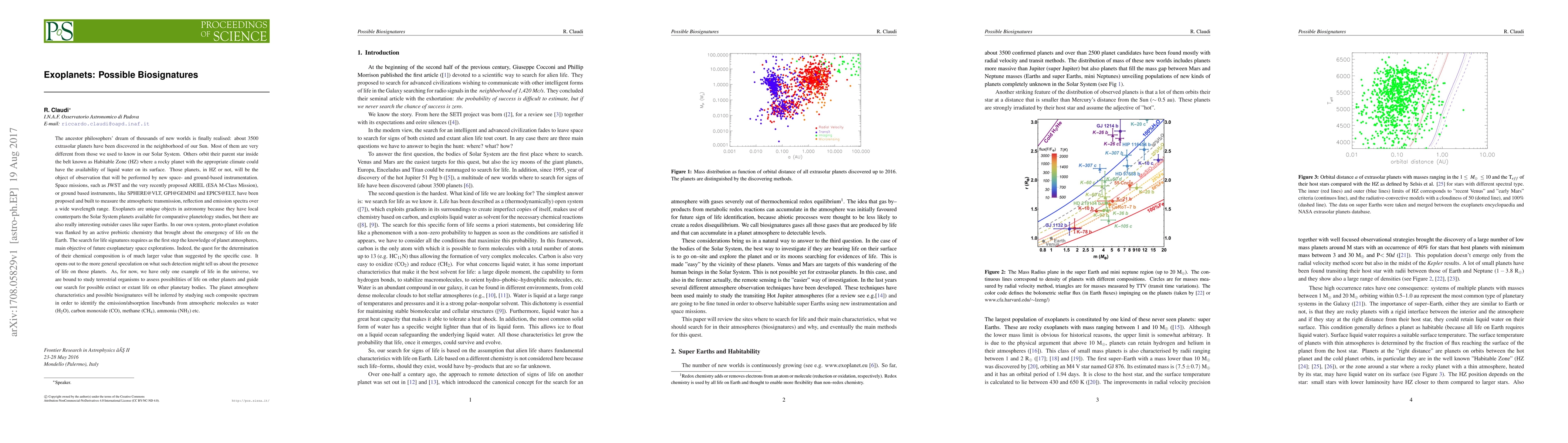 The ancestor philosophers' dream of thousands of new worlds is finally realised: about 3500 extrasolar planets have been discovered in the neighborhood of our Sun. Most of them are very different from those we used to know in our Solar System. Others orbit their parent star inside the belt known as Habitable Zone where a rocky planet with the appropriate climate could have the availability of liquid water on its surface. Those planets, in HZ or not, will be the object of observation that will be performed by new space-/ground-based instrumentation. Space missions, such as JWST and the very recently proposed ARIEL (ESA M-Class Mission), or ground based instruments (SPHERE@VLT, GPI@GEMINI and EPICS@ELT) have been proposed and built to measure the atmospheric transmission, reflection and emission spectra over a wide wavelength range. Most of exoplanets have local counterparts in the Solar System planets that are available for comparative studies, but there are also interesting outsider cases like super Earths. In our own system, proto-planet evolution was flanked by an active prebiotic chemistry that brought about the emergency of life on the Earth. The search for life signatures requires the knowledge of planet atmospheres, main objective of future exoplanetary space explorations. As, for now, we have only one example of life in the universe, we are bound to study terrestrial organisms to assess possibilities of life on other planets and guide our search for possible extinct or extant life on other planetary bodies. The planet atmosphere characteristics and possible biosignatures will be inferred by studying such composite spectrum in order to identify the emission/absorption lines/bands from atmospheric molecules as water, carbon monoxide, methane, ammonia etc.