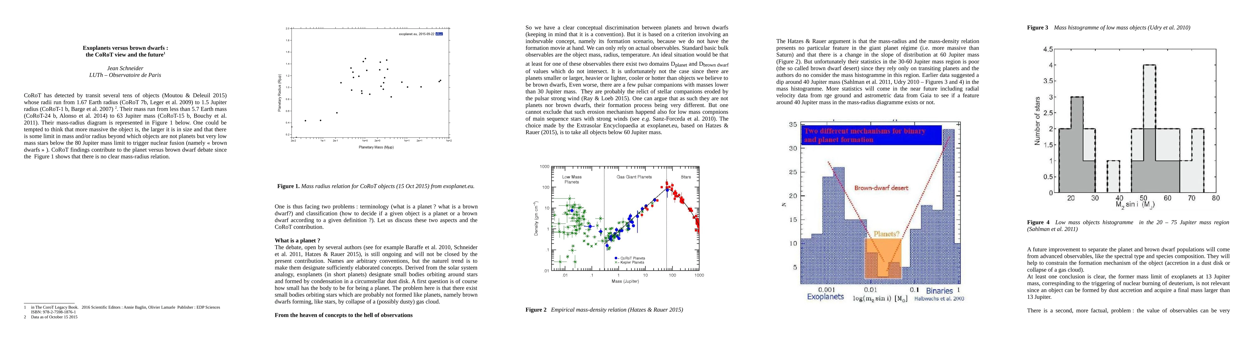 CoRoT has detected by transit several tens of objects whose radii run from 1.67 Earth radius. Their mass run from less than 5.7 Earth mass (CoRoT-24 b, Alonso et al. 2014) to 63 Jupiter mass (CoRoT-15 b, Bouchy et al. 2011). One could be tempted to think that more massive the object is, the larger it is in size and that there is some limit in mass and/or radius beyond which objects are not planets but very low mass stars below the 80 Jupiter mass limit to trigger nuclear fusion (namely "brown dwarfs" ). CoRoT findings contribute to the planet versus brown dwarf debate since there is no clear mass-radius relation.