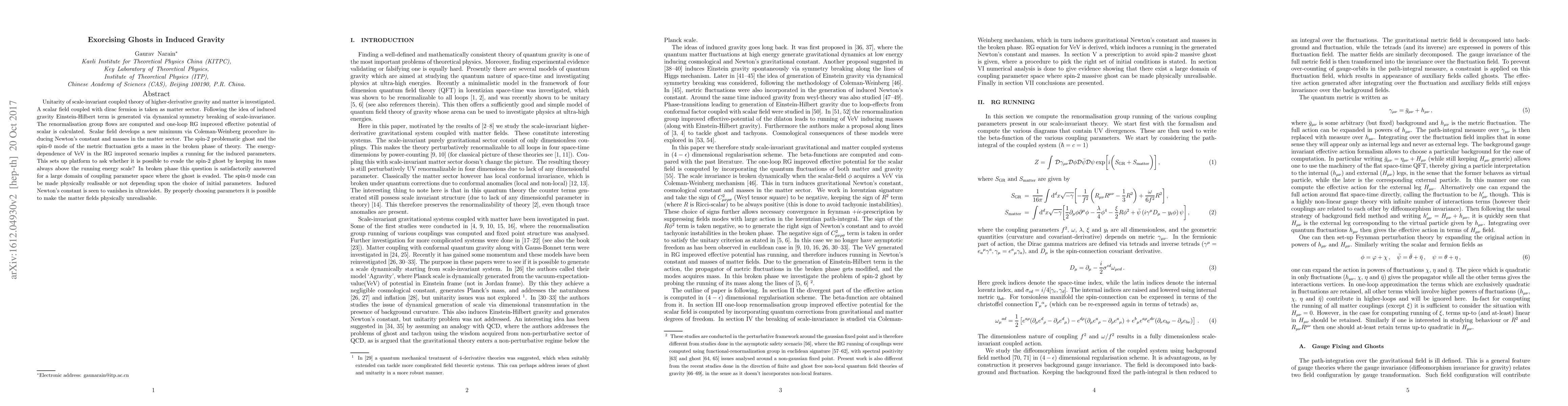 Unitarity of scale-invariant coupled theory of higher-derivative gravity and matter is investigated. A scalar field coupled with dirac fermion is taken as matter sector.Following the idea of induced gravity Einstein-Hilbert term is generated via dynamical symmetry breaking of scale-invariance. The renormalisation group flows are computed and one-loop RG improved effective potential of scalar is calculated. Scalar field develops a new minimum via Coleman-Weinberg procedure inducing Newton's constant and masses in the matter sector. The spin-2 problematic ghost and the spin-0 mode of the metric fluctuation gets a mass in the broken phase of theory. The energy-dependence of VeV in the RG improved scenario implies a running for the induced parameters. This sets up platform to ask whether it is possible to evade the spin-2 ghost by keeping its mass always above the running energy scale? In broken phase this question is satisfactorily answered for a large domain of coupling parameter space where the ghost is evaded. The spin-0 mode can be made physically realisable or not depending upon the choice of initial parameters. Induced Newton's constant is seen to vanishes in ultraviolet. By properly choosing parameters it is possible to make the matter fields physically unrealisable.
