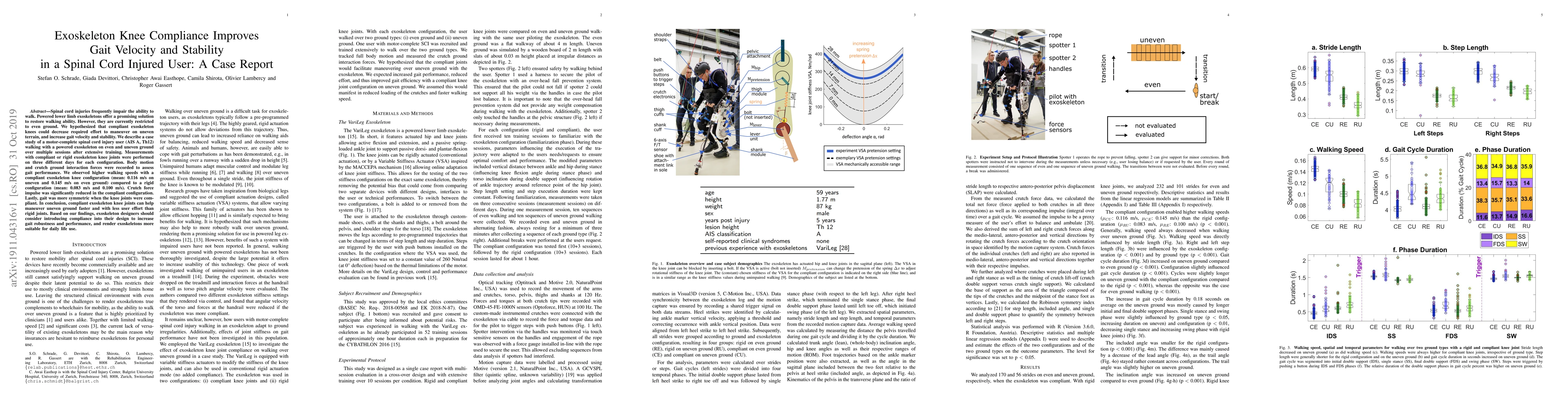 This case report demonstrates that a powered exoskeleton with compliant knee joints significantly improves gait velocity and stability for a spinal cord injury patient on both even and uneven terrain compared to a rigid knee configuration. The compliant exoskeleton reduced crutch force and increased symmetric gait, suggesting improved usability for daily life.