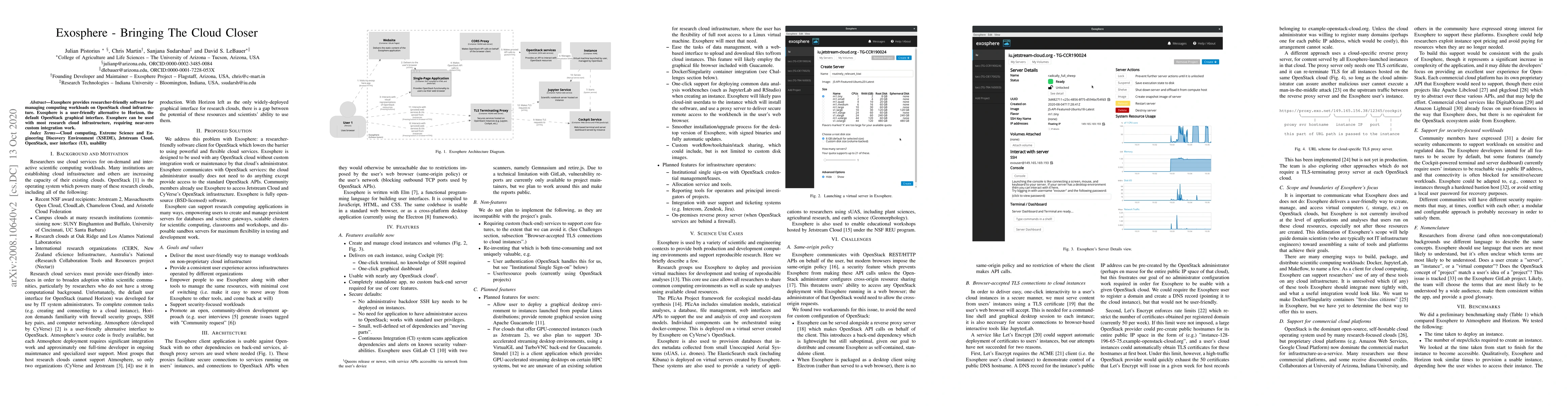 Exosphere provides researcher-friendly software for managing computing workloads on OpenStack cloud infrastructure. Exosphere is a user-friendly alternative to Horizon, the default OpenStack graphical interface. Exosphere can be used with most research cloud infrastructure, requiring near-zero custom integration work.