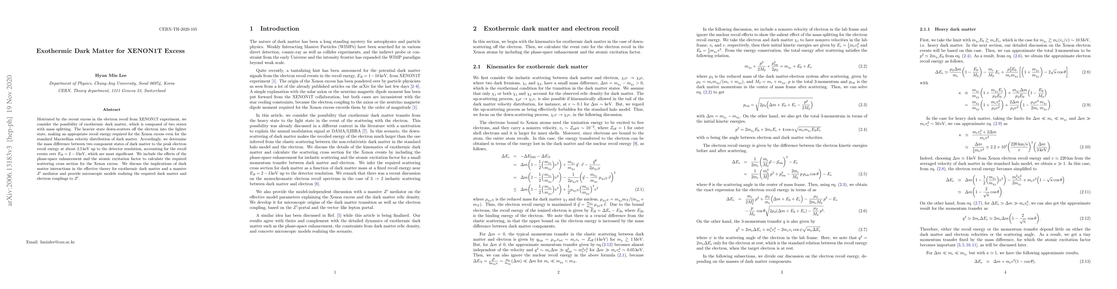 Motivated by the recent excess in the electron recoil from XENON1T experiment, we consider the possibility of exothermic dark matter, which is composed of two states with mass splitting. The heavier state down-scatters off the electron into the lighter state, making an appropriate recoil energy required for the Xenon excess even for the standard Maxwellian velocity distribution of dark matter. Accordingly, we determine the mass difference between two component states of dark matter to the peak electron recoil energy at about $2.5\,{\rm keV}$ up to the detector resolution, accounting for the recoil events over $E_R=2-3\,{\rm keV}$, which are most significant. We include the effects of the phase-space enhancement and the atomic excitation factor to calculate the required scattering cross section for the Xenon excess. We discuss the implications of dark matter interactions in the effective theory for exothermic dark matter and a massive $Z'$ mediator and provide microscopic models realizing the required dark matter and electron couplings to $Z'$.
