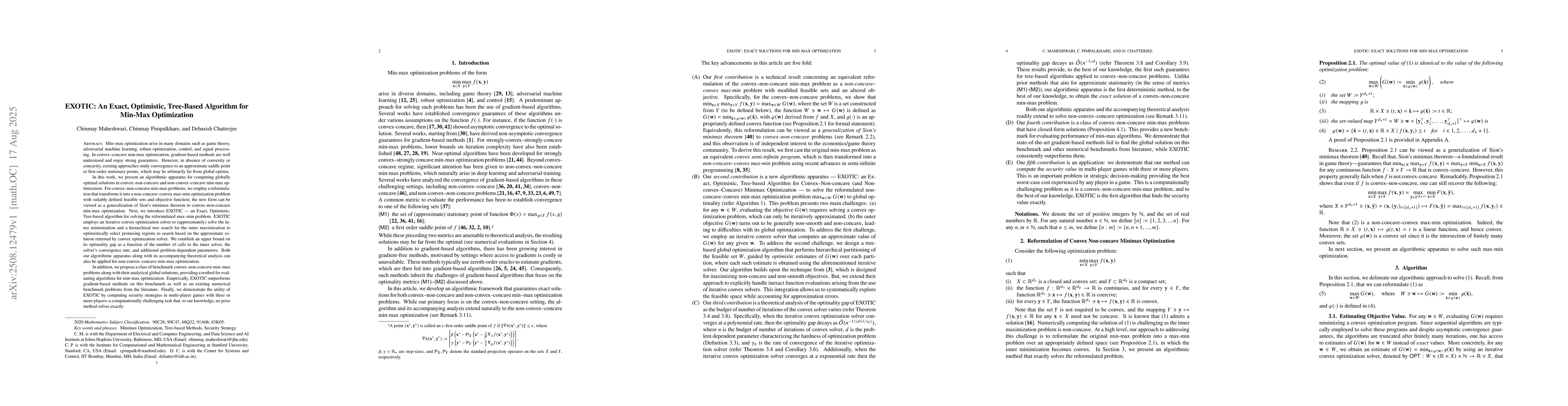 Min-max optimization arises in many domains such as game theory, adversarial machine learning, etc., with gradient-based methods as a typical computational tool. Beyond convex-concave min-max optimization, the solutions found by gradient-based methods may be arbitrarily far from global optima. In this work, we present an algorithmic apparatus for computing globally optimal solutions in convex-non-concave and non-convex-concave min-max optimization. For former, we employ a reformulation that transforms it into a non-concave-convex max-min optimization problem with suitably defined feasible sets and objective function. The new form can be viewed as a generalization of Sion's minimax theorem. Next, we introduce EXOTIC-an Exact, Optimistic, Tree-based algorithm for solving the reformulated max-min problem. EXOTIC employs an iterative convex optimization solver to (approximately) solve the inner minimization and a hierarchical tree search for the outer maximization to optimistically select promising regions to search based on the approximate solution returned by convex optimization solver. We establish an upper bound on its optimality gap as a function of the number of calls to the inner solver, the solver's convergence rate, and additional problem-dependent parameters. Both our algorithmic apparatus along with its accompanying theoretical analysis can also be applied for non-convex-concave min-max optimization. In addition, we propose a class of benchmark convex-non-concave min-max problems along with their analytical global solutions, providing a testbed for evaluating algorithms for min-max optimization. Empirically, EXOTIC outperforms gradient-based methods on this benchmark as well as on existing numerical benchmark problems from the literature. Finally, we demonstrate the utility of EXOTIC by computing security strategies in multi-player games with three or more players.