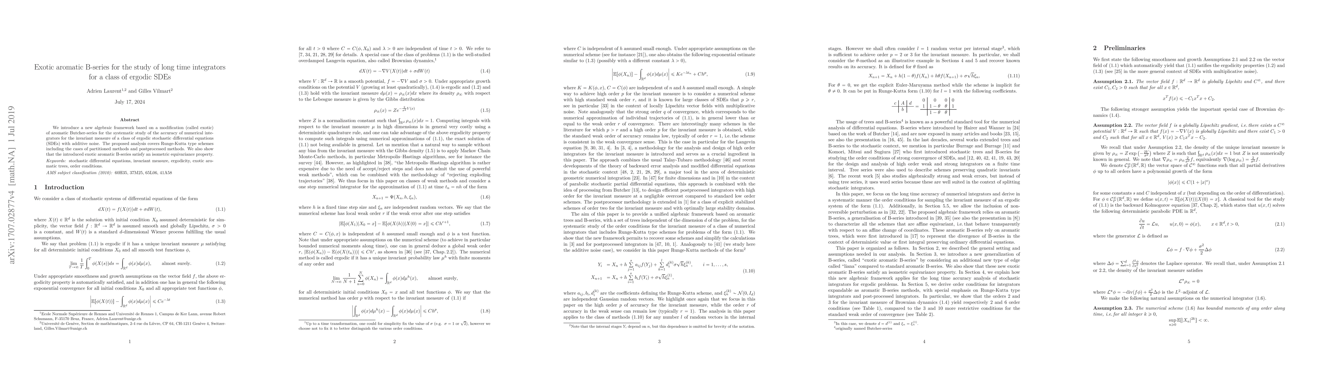 This paper proposes a new algebraic framework using modified aromatic Butcher-series (exotic aromatic B-series) to analyze the accuracy of numerical integrators for ergodic stochastic differential equations with additive noise. The study includes Runge-Kutta schemes and highlights the isometric equivariance property of the introduced framework.