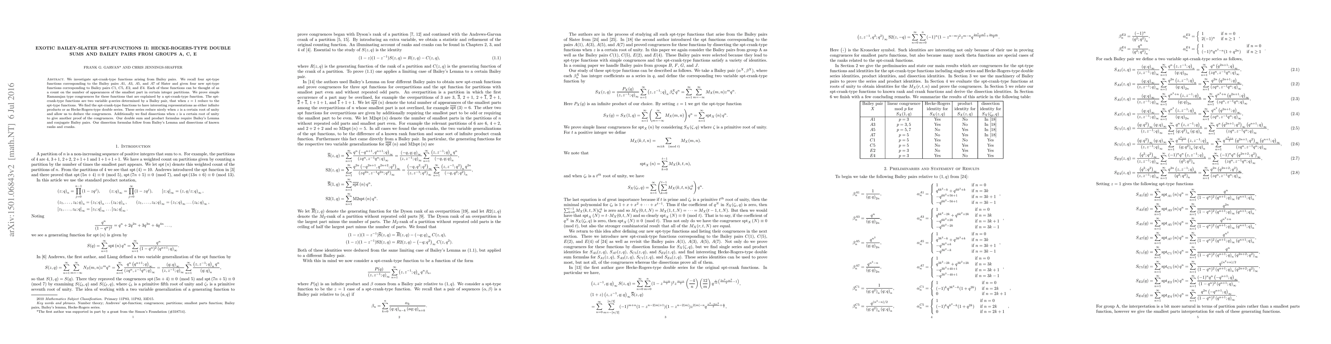 This paper studies spt-crank-type functions derived from Bailey pairs, introducing new functions corresponding to Bailey pairs $C1$, $C5$, $E2$, and $E4$. It proves Ramanujan-type congruences for these functions, demonstrating their representations as infinite products or Hecke-Rogers-type double sums, with special reductions when $z$ is a root of unity.