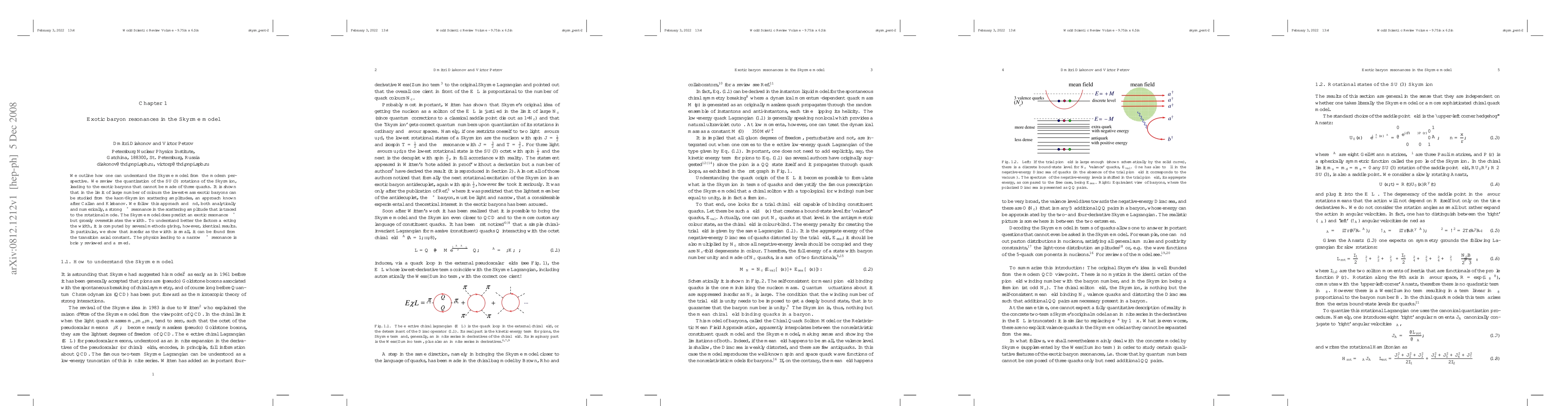 This paper reviews the quantization of SU(3) rotations in the Skyrme model to identify exotic baryons, particularly the Theta+ resonance, and demonstrates its existence through kaon-Skyrmion scattering. Despite the model's overestimation of the resonance's width, it provides a consistent method for computing the width based on the transition axial constant.