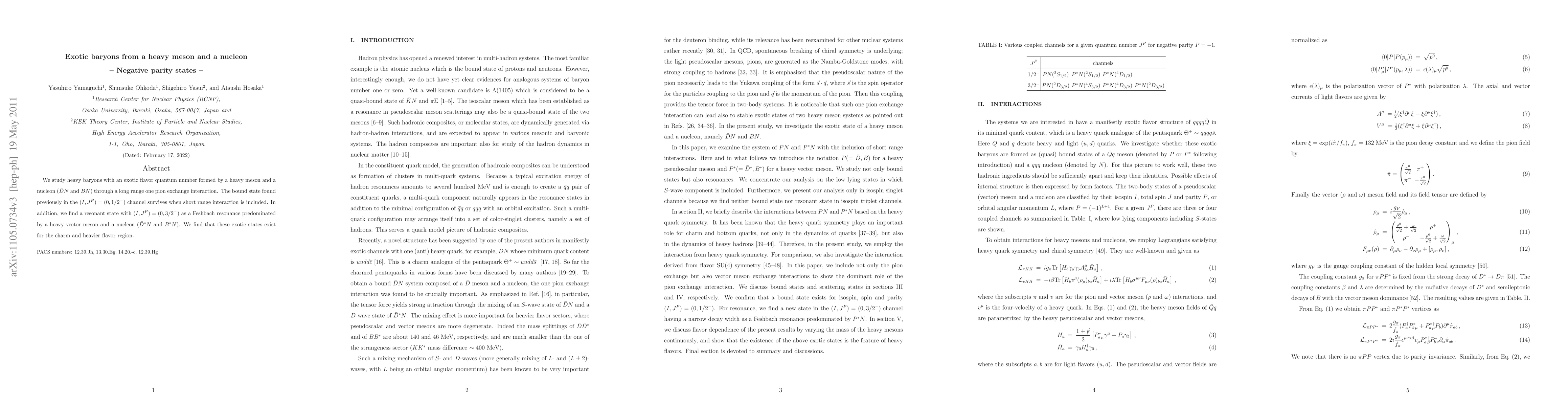 We study heavy baryons with an exotic flavor quantum number formed by a heavy meson and a nucleon (Dbar-N and B-N) through a long range one pion exchange interaction. The bound state found previously in the (I,JP) =(0,1/2-) channel survives when short range interaction is included. In addition, we find a resonant state with (I,JP)=(0,3/2-) as a Feshbach resonance predominated by a heavy vector meson and a nucleon (Dbar*-N and B*-N). We find that these exotic states exist for the charm and heavier flavor region.