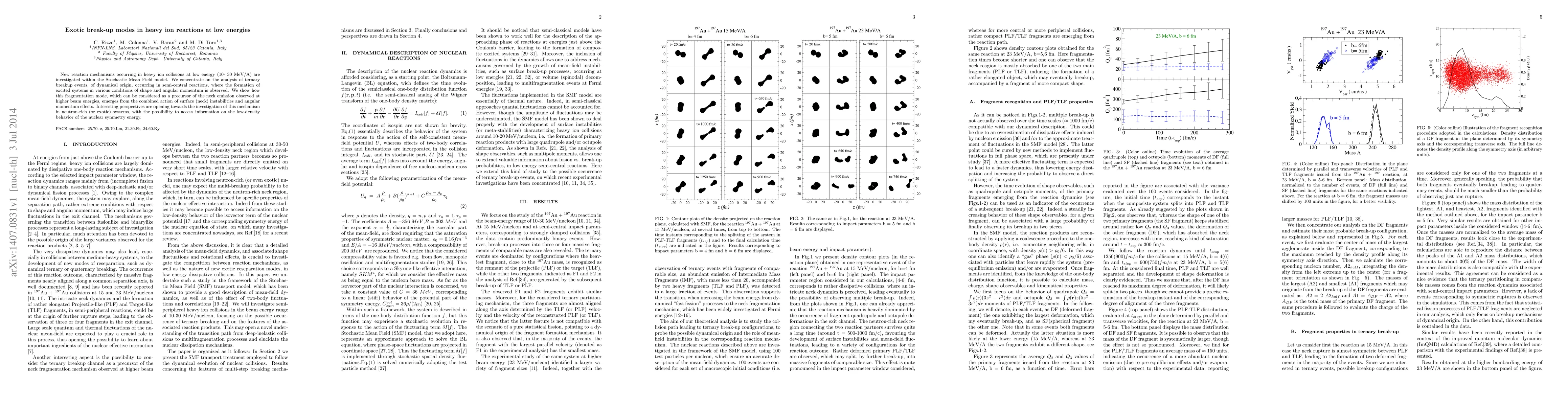 This paper investigates new reaction mechanisms in heavy ion collisions at low energies using the Stochastic Mean Field model, focusing on ternary breakup events in semi-central reactions. It reveals how these breakup modes, precursors to neck emission at higher energies, emerge from surface instabilities and angular momentum effects, offering insights into the low-density behavior of nuclear symmetry energy.