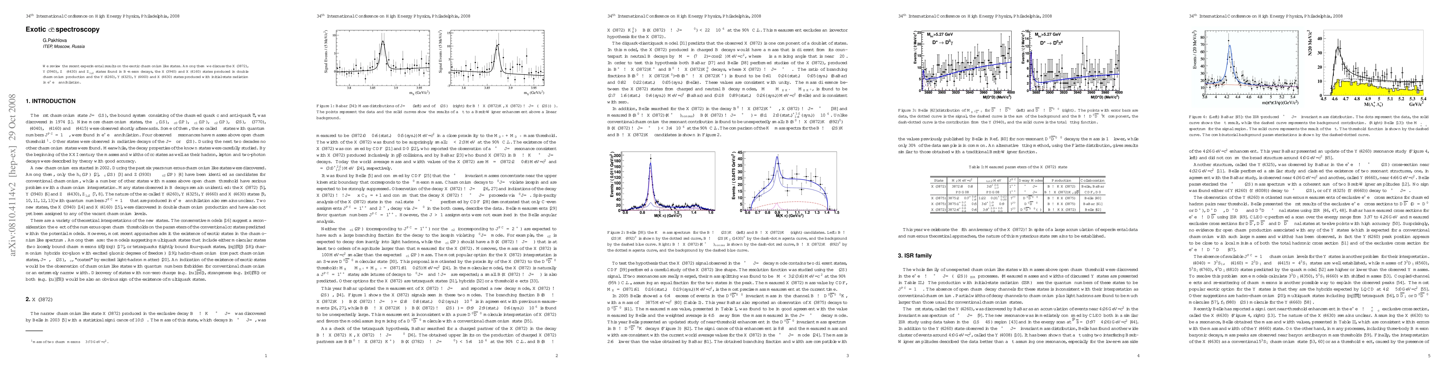 We review the recent experimental results on the exotic charmoniumlike states. Among them we discuss the X(3872), Y(3940), Z^\pm(4430) and Z^\pm_{1,2} states found in B-meson decays, the X(3940) and X(4160) states produced in double charmonium production and the Y(4260), Y(4325), Y(4660) and X(4630) states produced with initial-state radiation in e^+e^- annihilation.