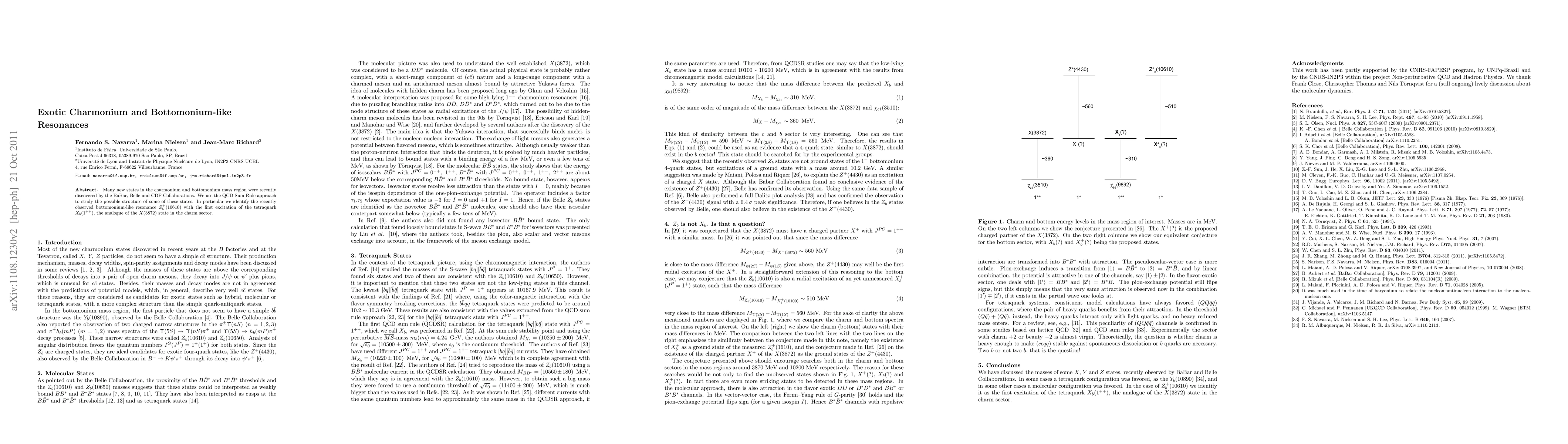 Many new states in the charmonium and bottomonium mass region were recently discovered by the BaBar, Belle and CDF Collaborations. We use the QCD Sum Rule approach to study the possible structure of some of these states. In particular we identify the recently observed bottomonium-like resonance $Z_b^+(10610)$ with the first excitation of the tetraquark $X_b(1^{++})$, the analogue of the X(3872) state in the charm sector.