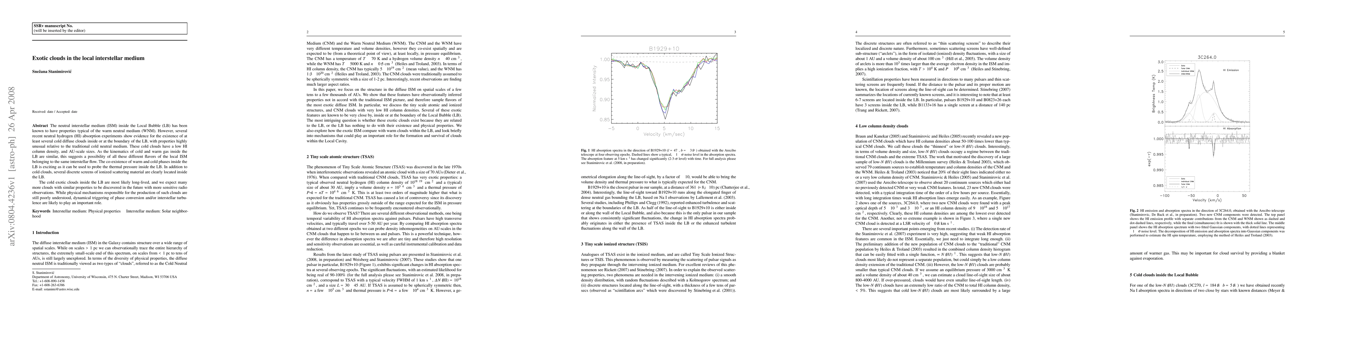 The neutral interstellar medium (ISM) inside the Local Bubble (LB) has been known to have properties typical of the warm neutral medium (WNM). However, several recent neutral hydrogen (HI) absorption experiments show evidence for the existence of at least several cold diffuse clouds inside or at the boundary of the LB, with properties highly unusual relative to the traditional cold neutral medium. These cold clouds have a low HI column density, and AU-scale sizes. As the kinematics of cold and warm gas inside the LB are similar, this suggests a possibility of all these different flavors of the local ISM belonging to the same interstellar flow. The co-existence of warm and cold phases inside the LB is exciting as it can be used to probe the thermal pressure inside the LB. In addition to cold clouds, several discrete screens of ionized scattering material are clearly located inside the LB. The cold exotic clouds inside the LB are most likely long-lived, and we expect many more clouds with similar properties to be discovered in the future with more sensitive radio observations. While physical mechanisms responsible for the production of such clouds are still poorly understood, dynamical triggering of phase conversion and/or interstellar turbulence are likely to play an important role.