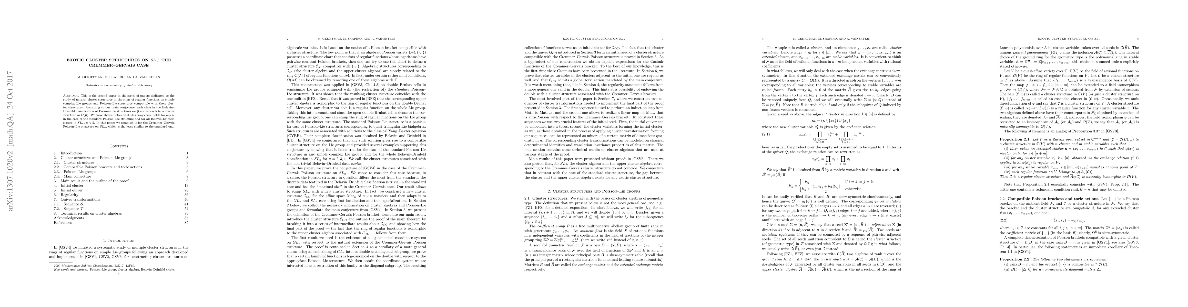 This paper confirms the main conjecture linking Belavin-Drinfeld classes of Poisson-Lie structures to cluster structures in function rings of simple complex Lie groups, specifically focusing on the Cremmer-Gervais Poisson-Lie structure in $SL_n$ and extending previous results to $n<5$.