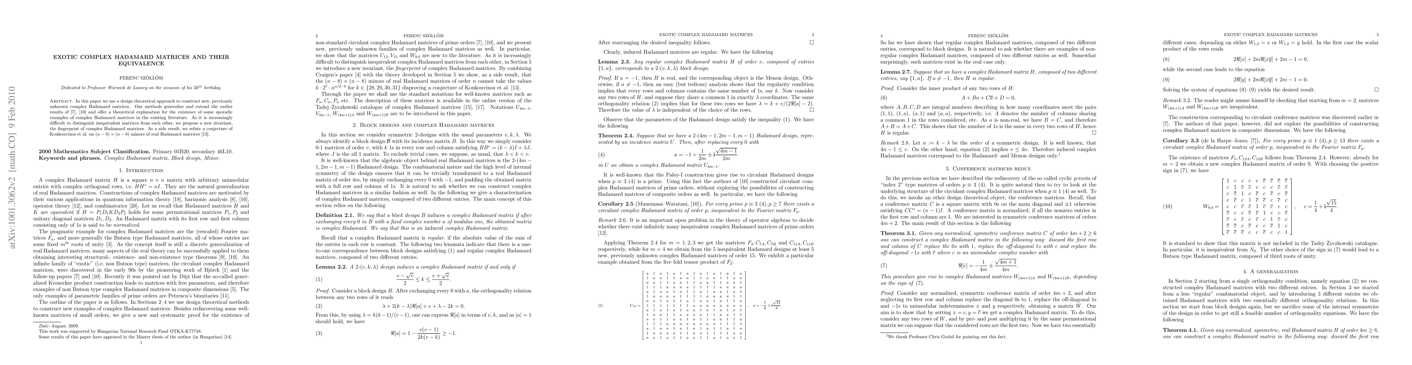 In this paper we use a design theoretical approach to construct new, previously unknown complex Hadamard matrices. Our methods generalize and extend the earlier results of de la Harpe--Jones and Munemasa--Watatani and offer a theoretical explanation for the existence of some sporadic examples of complex Hadamard matrices in the existing literature. As it is increasingly difficult to distinguish inequivalent matrices from each other, we propose a new invariant, the fingerprint of complex Hadamard matrices. As a side result, we refute a conjecture of Koukouvinos et al. on (n-8)x(n-8) minors of real Hadamard matrices.