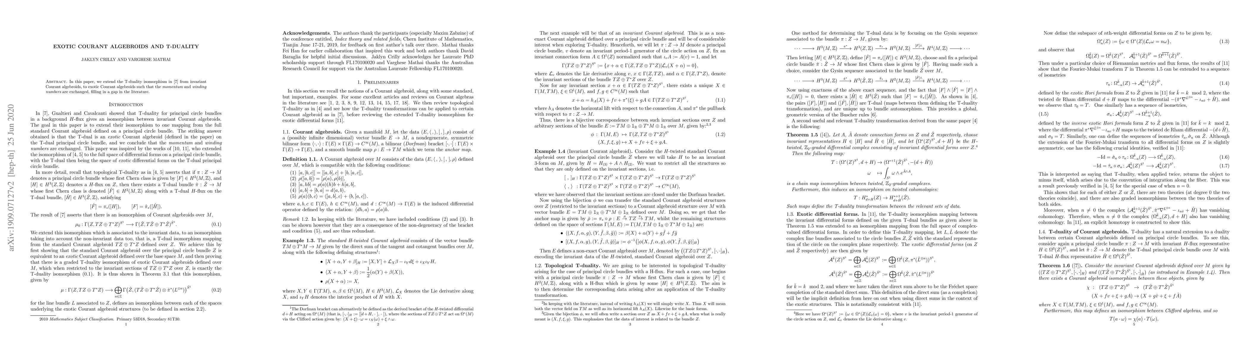 Summary: This paper extends T-duality from invariant to exotic exact Courant algebroids, exchanging momentum and winding numbers, thereby addressing a gap in existing T-duality literature.