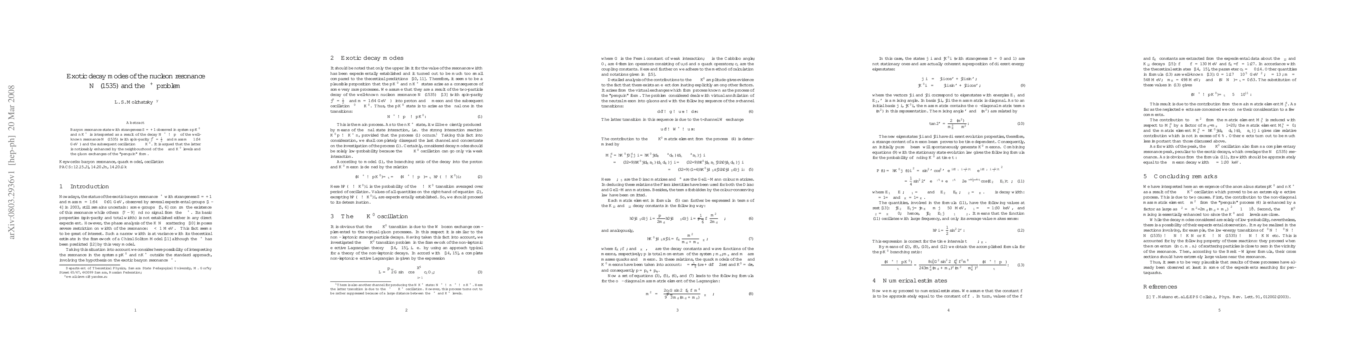 Baryon resonance state with strangeness $S = +1$ observed in systems $p K^0$ and $n K^+$ is interpreted as a result of the decay $N^{*+} \to p \eta$ of the well-known resonance $N^*(1535)$ (with spin-parity $j^P = {1/2}^-$ and mass $m \approx 1.54$ GeV) and the subsequent oscillation $\eta \rightleftarrows K^0$. It is argued that the latter is noticeably enhanced by the neighbourhood of the $\eta$ and $K^0$ levels and the gluon exchanges of the "penguin" form.