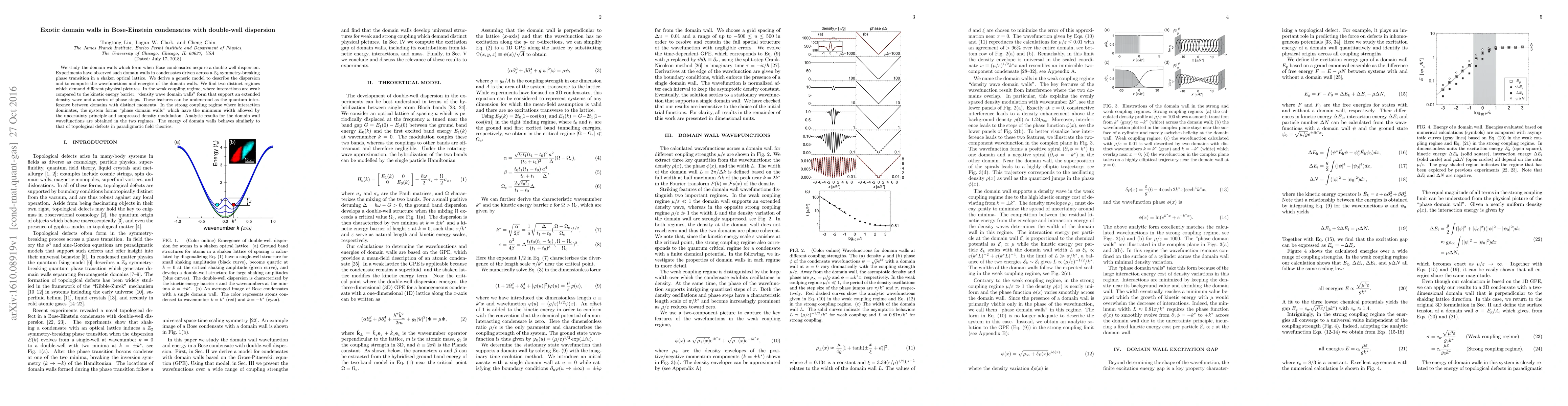We study the domain walls which form when Bose condensates acquire a double-well dispersion. Experiments have observed such domain walls in condensates driven across a $\mathbb{Z}_2$ symmetry-breaking phase transition in a shaken optical lattice. We derive a generic model to describe the dispersion and to compute the wavefunctions and energies of the domain walls. We find two distinct regimes which demand different physical pictures. In the weak coupling regime, where interactions are weak compared to the kinetic energy barrier, "density wave domain walls" form that support an extended density wave and a series of phase steps. These features can be understood as the quantum interference between domains with distinct momenta. In the strong coupling regime where interaction dominates, the system forms "phase domain walls" which have the minimum width allowed by the uncertainty principle and suppressed density modulation. Analytic results for the domain wall wavefunctions are obtained in the two regimes. The energy of domain walls behaves similarly to that of topological defects in paradigmatic field theories.