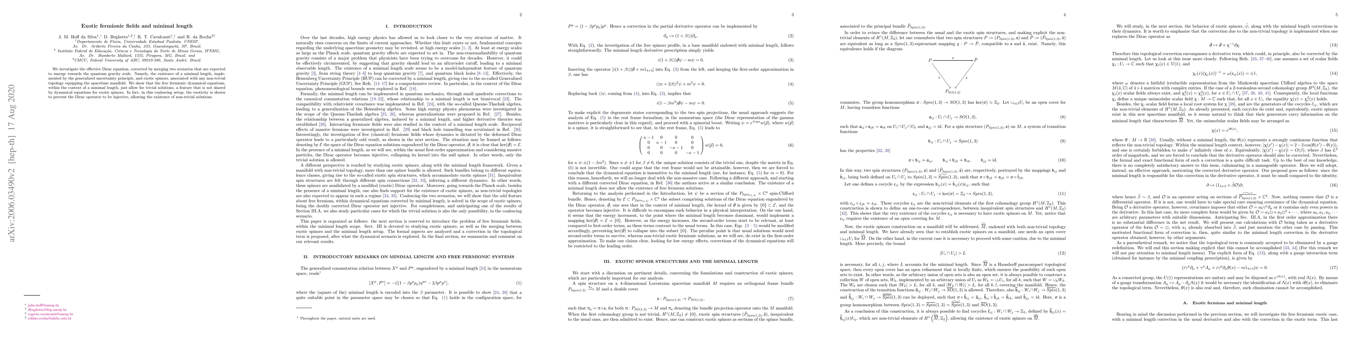 We investigate the effective Dirac equation, corrected by merging two scenarios that are expected to emerge towards the quantum gravity scale. Namely, the existence of a minimal length, implemented by the generalized uncertainty principle, and exotic spinors, associated with any non-trivial topology equipping the spacetime manifold. We show that the free fermionic dynamical equations, within the context of a minimal length, just allow for trivial solutions, a feature that is not shared by dynamical equations for exotic spinors. In fact, in this coalescing setup, the exoticity is shown to prevent the Dirac operator to be injective, allowing the existence of non-trivial solutions.