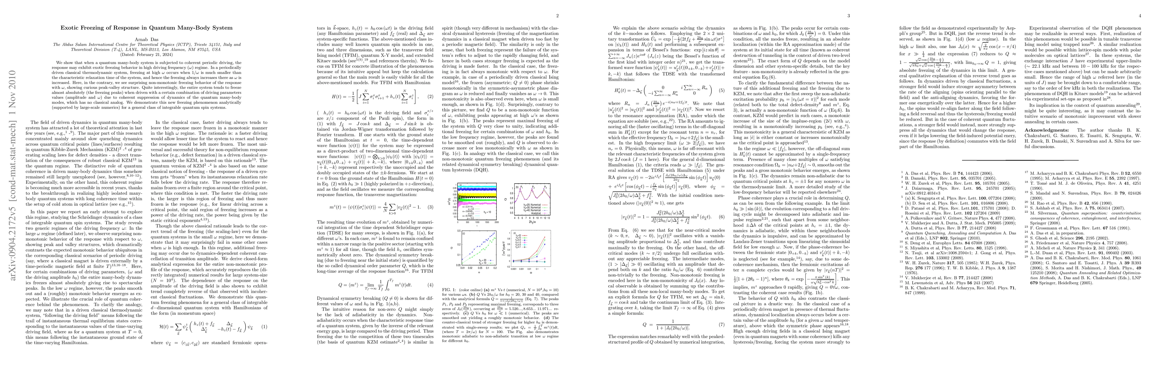We show that when a quantum many-body system is subjected to coherent periodic driving, the response may exhibit exotic freezing behavior in high driving frequency ($\omega$) regime. In a periodically driven classical thermodynamic system, freezing at high $\omega$ occurs when $1/\omega$ is much smaller than the characteristic relaxation time of the system, and hence the freezing always increases there as $\omega$ is increased. Here, in the contrary, we see surprising non-monotonic freezing behavior of the response with $\omega$, showing curious peak-valley structure. Quite interestingly, the entire system tends to freeze almost absolutely (the freezing peaks) when driven with a certain combination of driving parameters values (amplitude and $\omega$) due to coherent suppression of dynamics of the quantum many-body modes, which has no classical analog. We demonstrate this new freezing phenomenon analytically (supported by large-scale numerics) for a general class of integrable quantum spin systems.