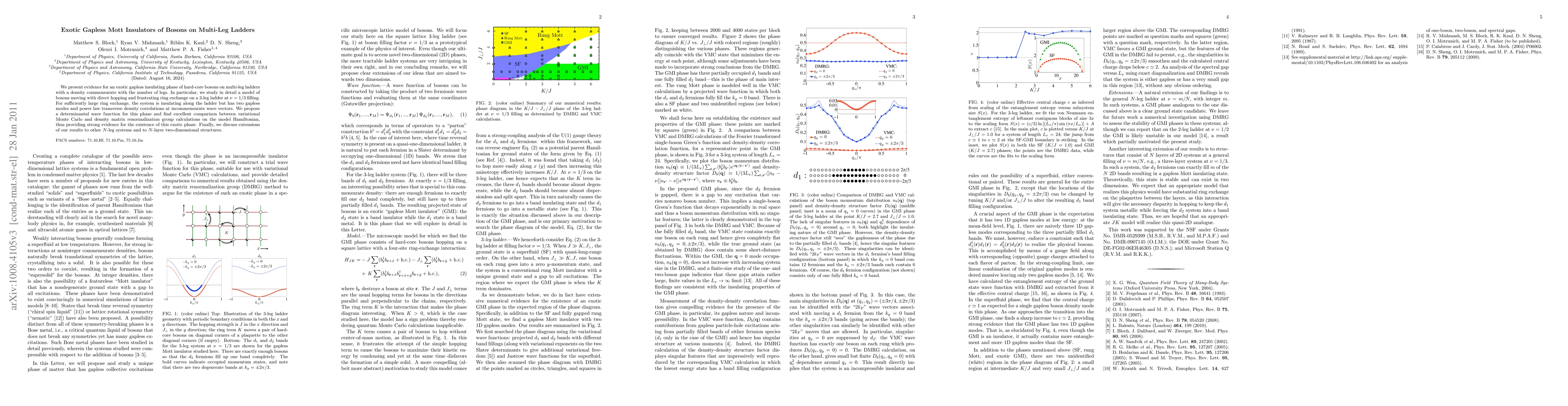 We present evidence for an exotic gapless insulating phase of hard-core bosons on multi-leg ladders with a density commensurate with the number of legs. In particular, we study in detail a model of bosons moving with direct hopping and frustrating ring exchange on a 3-leg ladder at $\nu=1/3$ filling. For sufficiently large ring exchange, the system is insulating along the ladder but has two gapless modes and power law transverse density correlations at incommensurate wave vectors. We propose a determinantal wave function for this phase and find excellent comparison between variational Monte Carlo and density matrix renormalization group calculations on the model Hamiltonian, thus providing strong evidence for the existence of this exotic phase. Finally, we discuss extensions of our results to other $N$-leg systems and to $N$-layer two-dimensional structures.