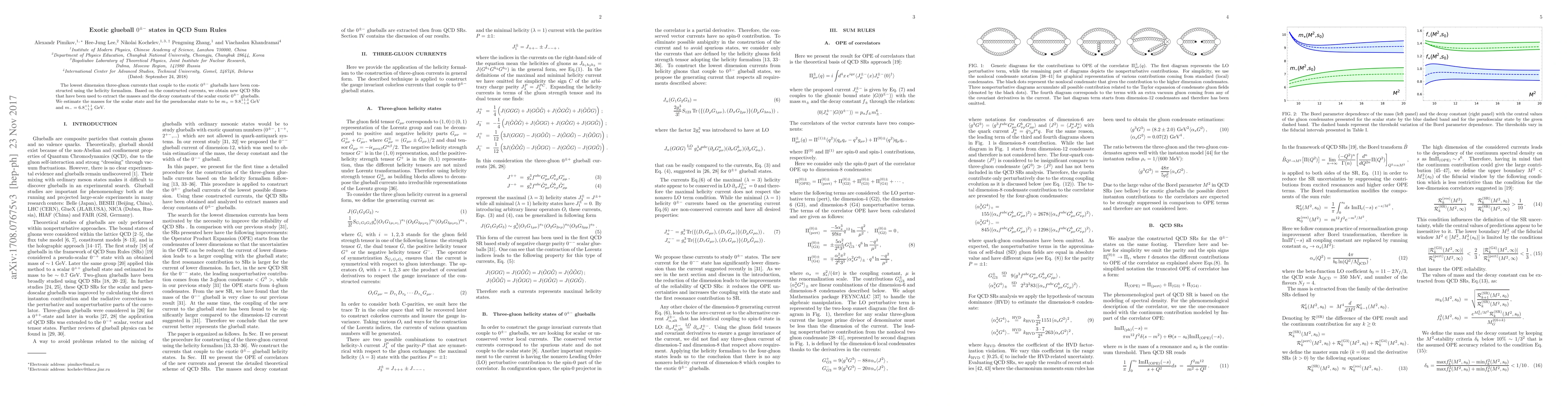 The lowest dimension three-gluon currents that couple to the exotic $0^{\pm-}$ glueballs have been constructed using the helicity formalism. Based on the constructed currents, we obtain new QCD SRs that have been used to extract the masses and the decay constants of the scalar exotic $0^{\pm-}$ glueballs. We estimate the masses for the scalar state and for the pseudoscalar state to be ${m_+=9.8^{+1.3}_{-1.4}}$ GeV and $m_-=6.8^{+1.1}_{-1.2}$ GeV.