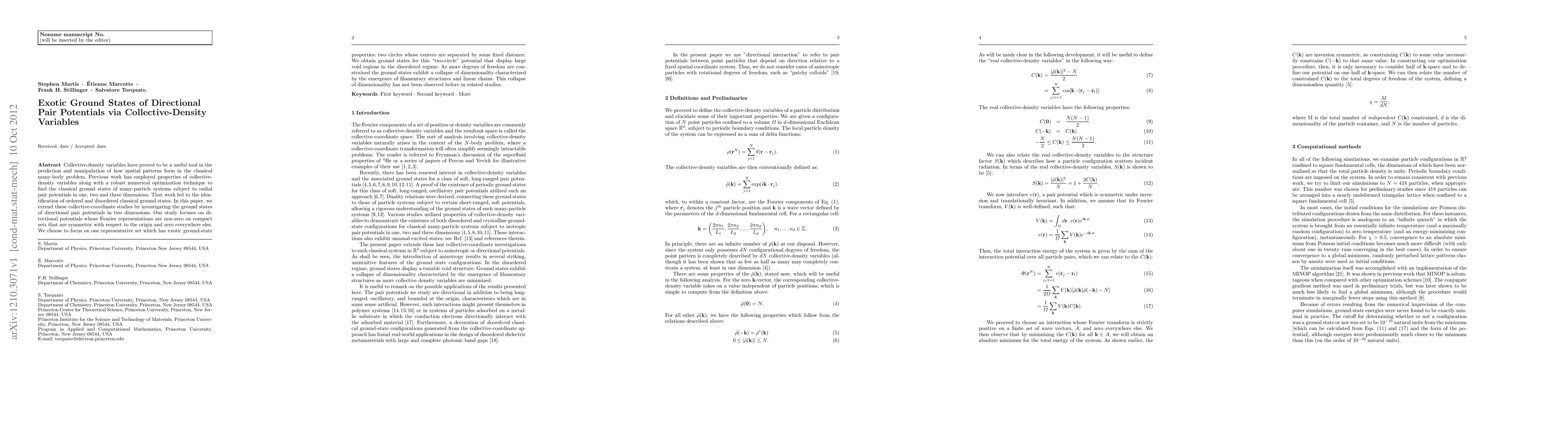 Collective-density variables have proved to be a useful tool in the prediction and manipulation of how spatial patterns form in the classical many-body problem. Previous work has employed properties of collective-density variables along with a robust numerical optimization technique to find the classical ground states of many-particle systems subject to radial pair potentials in one, two and three dimensions. That work led to the identification of ordered and disordered classical ground states. In this paper, we extend these collective-coordinate studies by investigating the ground states of directional pair potentials in two dimensions. Our study focuses on directional potentials whose Fourier representations are non-zero on compact sets that are symmetric with respect to the origin and zero everywhere else. We choose to focus on one representative set which has exotic ground-state properties: two circles whose centers are separated by some fixed distance. We obtain ground states for this "two-circle" potential that display large void regions in the disordered regime. As more degrees of freedom are constrained the ground states exhibit a collapse of dimensionality characterized by the emergence of filamentary structures and linear chains. This collapse of dimensionality has not been observed before in related studies.
