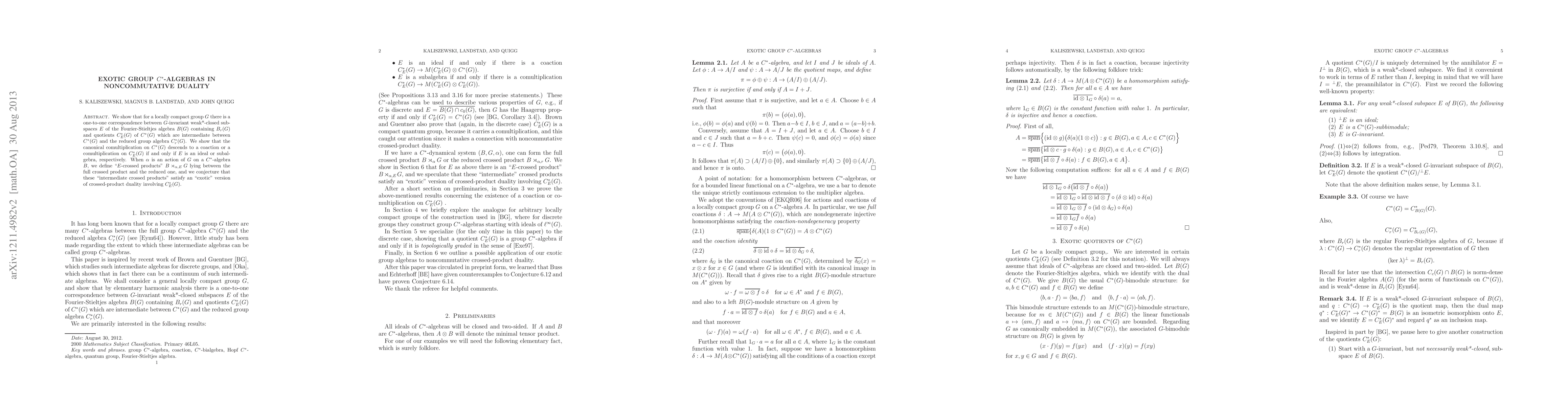 We show that for a locally compact group G there is a one-to-one correspondence between G-invariant weak*-closed subspaces E of the Fourier-Stieltjes algebra B(G) containing B_r(G) and quotients C*_E(G) of C*(G) which are intermediate between C*(G) and the reduced group algebra C*_r(G). We show that the canonical comultiplication on C*(G) descends to a coaction or a comultiplication on C*_E(G) if and only if E is an ideal or subalgebra, respectively. When \alpha is an action of G on a C*-algebra B, we define "E-crossed products" B\rtimes_{\alpha,E} G lying between the full crossed product and the reduced one, and we conjecture that these "intermediate crossed products" satisfy an "exotic" version of crossed-product duality involving C*_E(G).