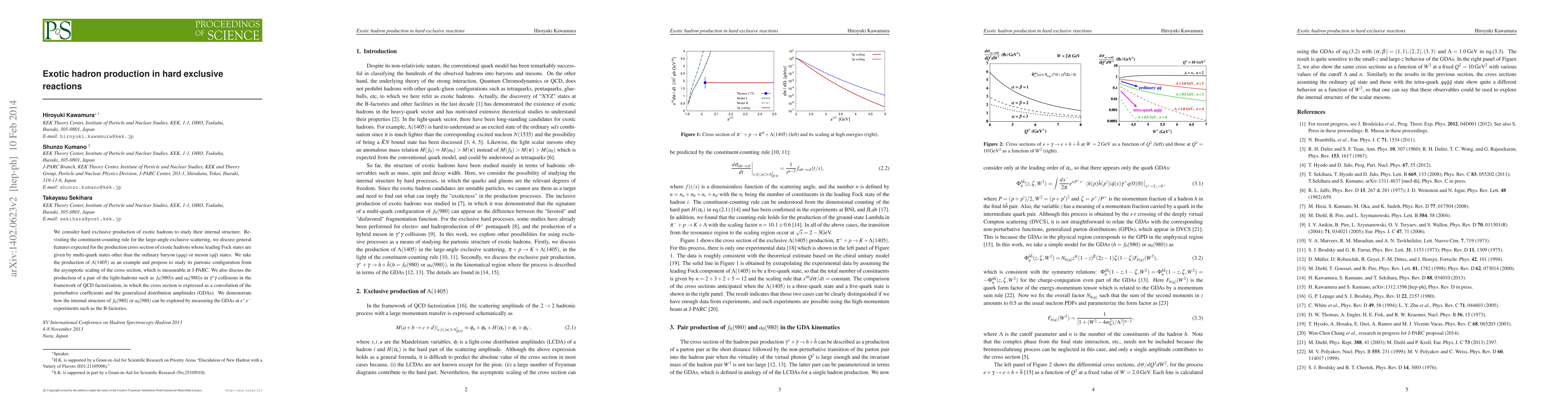 We consider hard exclusive production of exotic hadrons to study their internal structure. Revisiting the constituent-counting rule for the large-angle exclusive scattering, we discuss general features expected for the production cross section of exotic hadrons whose leading Fock states are given by multi-quark states other than the ordinary baryon ($qqq$) or meson ($q\bar{q}$) states.We take the production of $\Lambda(1405)$ as an example and propose to study its partonic configuration from the asymptotic scaling of the cross section, which is measurable at J-PARC. We also discuss the production of a pair of the light-hadrons such as $f_0(980)$s and $a_0(980)$s in $\gamma^*\gamma$ collisions in the framework of QCD factorization, in which the cross section is expressed as a convolution of the perturbative coefficients and the generalized distribution amplitudes (GDAs). We demonstrate how the internal structure of $f_0(980)$ or $a_0(980)$ can be explored by measuring the GDAs at $e^+e^-$ experiments such as the B-factories.