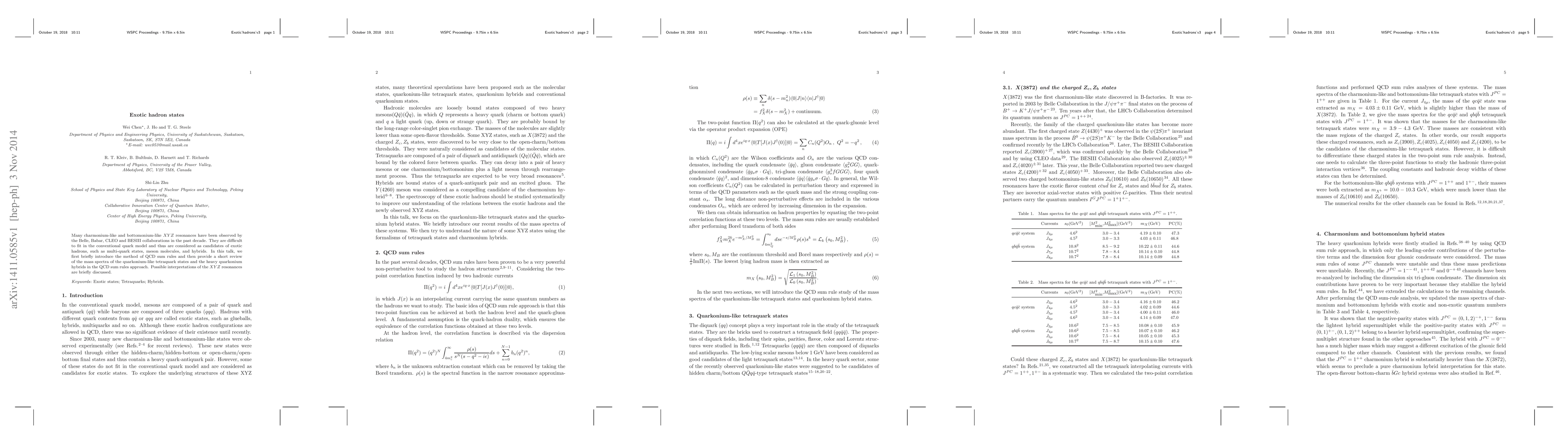 The paper discusses exotic hadron states like tetraquarks and hybrids observed in charmonium-like and bottomonium-like XYZ resonances. It reviews their mass spectra using QCD sum rules, suggesting possible interpretations of these unconventional particles.