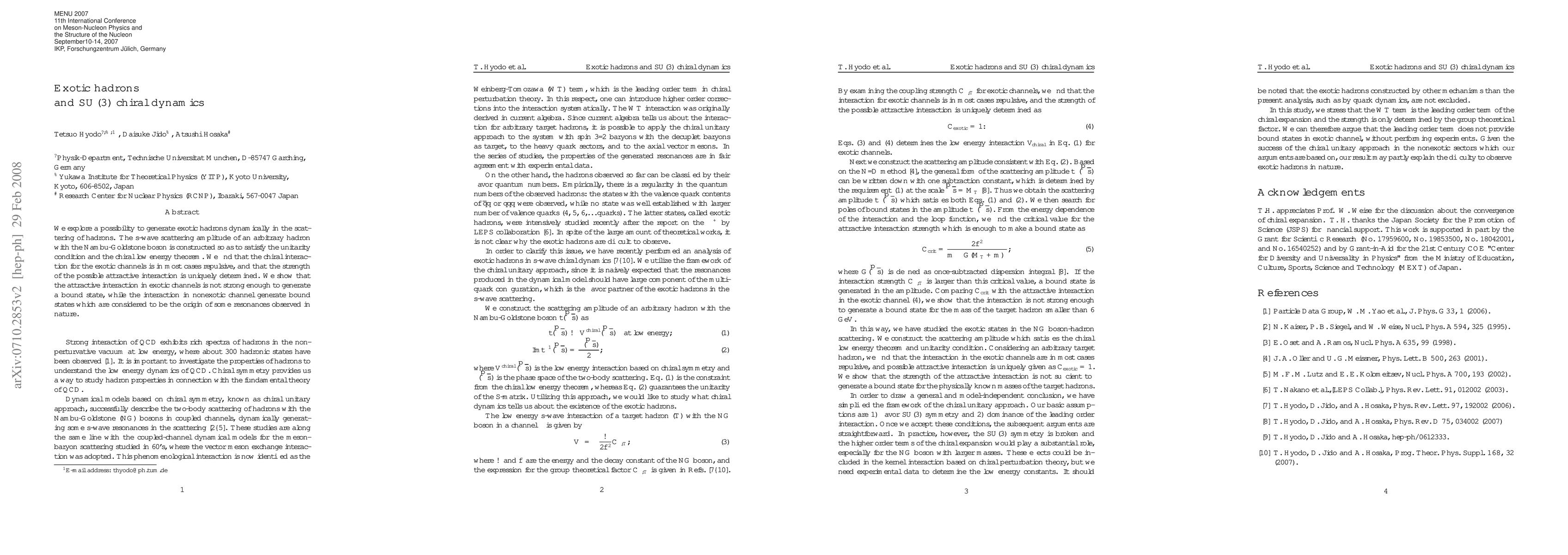 We explore a possibility to generate exotic hadrons dynamically in the scattering of hadrons. The s-wave scattering amplitude of an arbitrary hadron with the Nambu-Goldstone boson is constructed so as to satisfy the unitarity condition and the chiral low energy theorem. We find that the chiral interaction for the exotic channels is in most cases repulsive, and that the strength of the possible attractive interaction is uniquely determined. We show that the attractive interaction in exotic channels is not strong enough to generate a bound state, while the interaction in nonexotic channel generate bound states which are considered to be the origin of some resonances observed in nature.