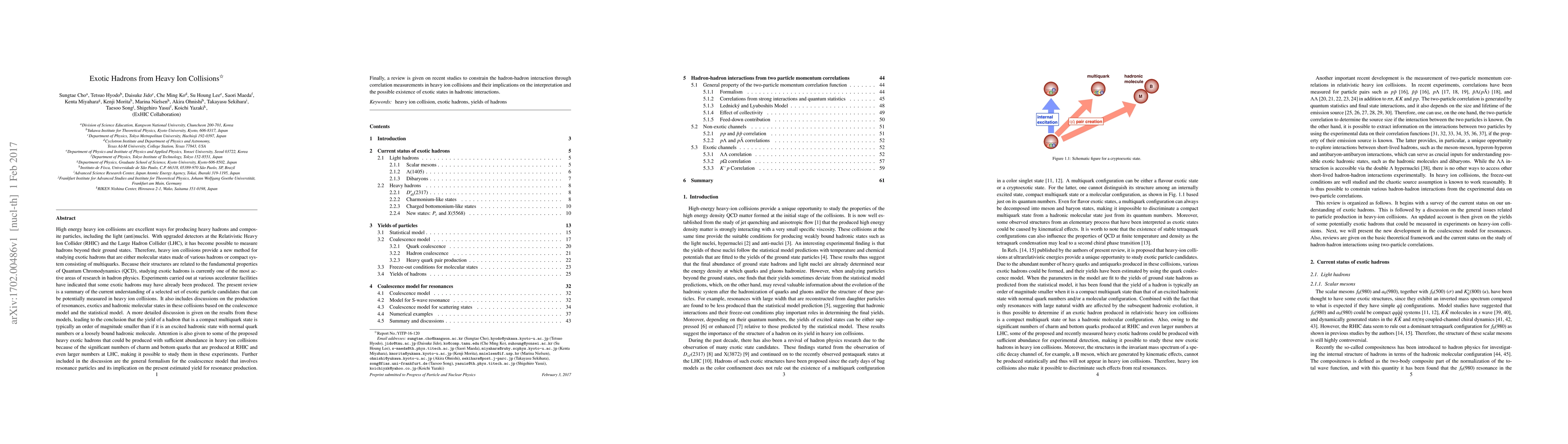 Heavy ion collisions (HIC) at high energies are excellent ways for producing heavy hadrons and composite particles. With upgraded detectors at RHIC and LHC, it has become possible to measure hadrons beyond their ground states. Therefore, HIC provide a new method for studying exotic hadrons that are either hadronic molecular states or compact multiquark systems. Because their structures are related to the fundamental properties of QCD, studying exotic hadrons is currently one of the most active areas of research in hadron physics. Experiments carried out at various accelerator facilities have indicated that some exotic hadrons may have already been produced. The present review is a summary of the current understanding of a selected set of exotic particle candidates that can be potentially measured in HIC. It also includes discussions on the production of exotic hadrons in HIC based on the coalescence and statistical models. A more detailed discussion leads to the conclusion that the yield of a hadron is typically an order of magnitude smaller when it is a compact multiquark state than that of an excited hadronic state with normal quark numbers and/or a molecular configuration. Attention is also given to some of the proposed heavy exotic hadrons that could be produced with sufficient abundance in HIC because of the significant numbers of charm and bottom quarks produced at RHIC and LHC, making it possible to study them in these experiments. Further included in the discussion are the general formalism for the coalescence model that involves resonance particles and its implication on the present estimated yield for resonance production. Finally, a review is given on recent studies to constrain the hadron-hadron interaction through correlation measurements in HIC and their implications on the interpretation and the possible existence of exotic states in hadronic interactions.