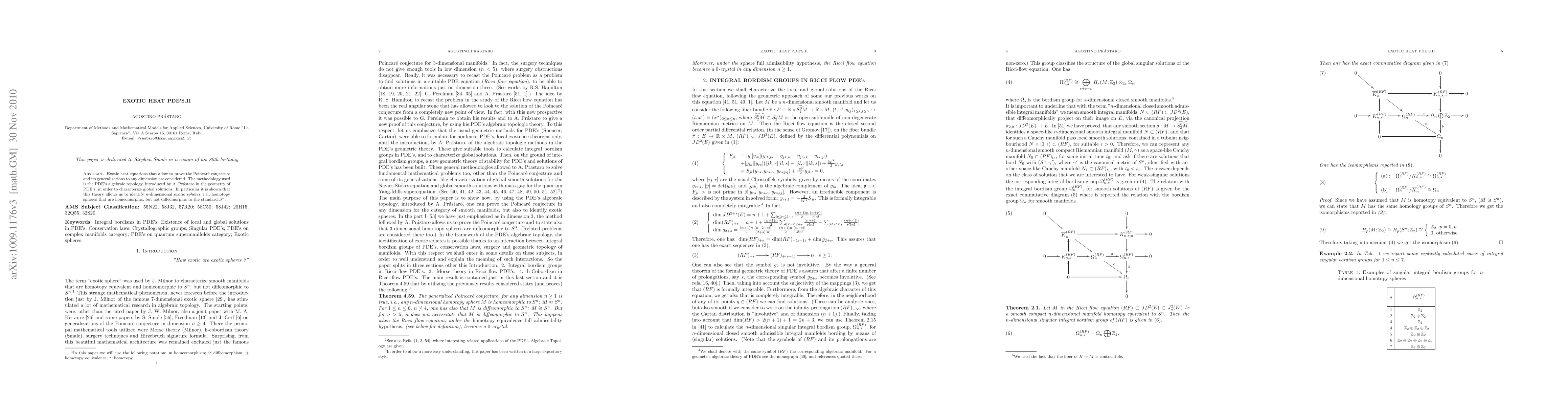 Exotic heat equations that allow to prove the Poincar\'e conjecture and its generalizations to any dimension are considered. The methodology used is the PDE's algebraic topology, introduced by A. Pr\'astaro in the geometry of PDE's, in order to characterize global solutions. In particular it is shown that this theory allows us to identify $n$-dimensional {\em exotic spheres}, i.e., homotopy spheres that are homeomorphic, but not diffeomorphic to the standard $S^n$.